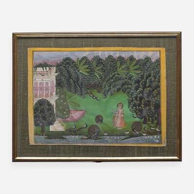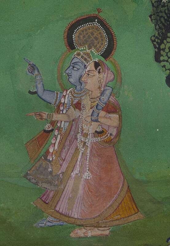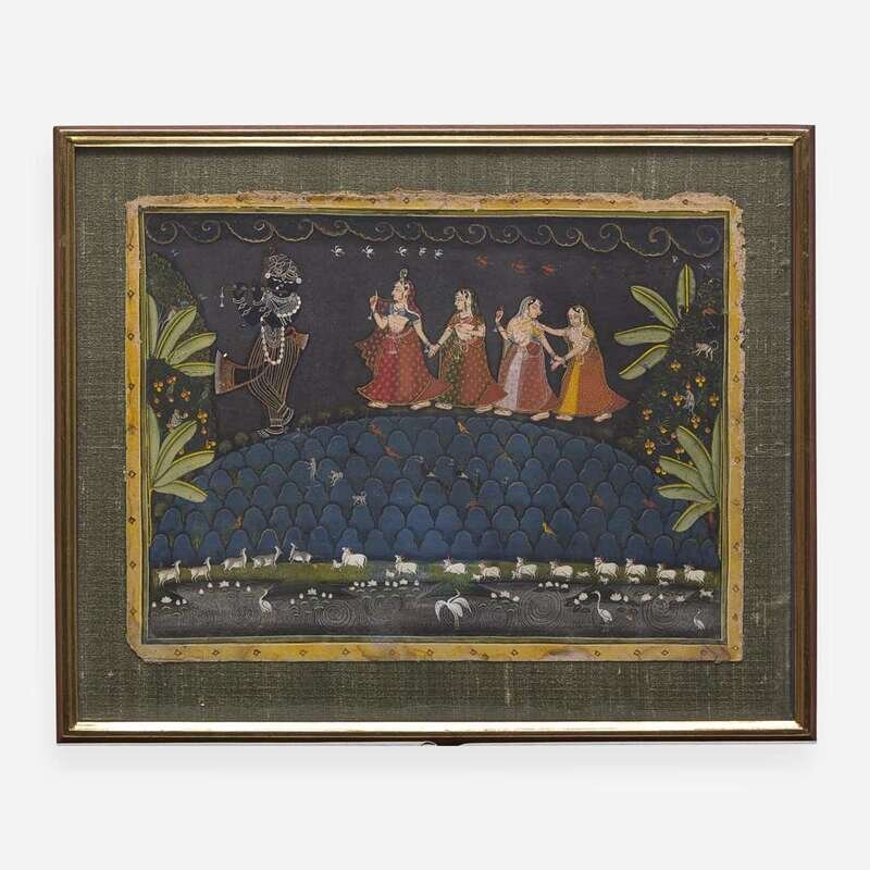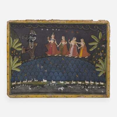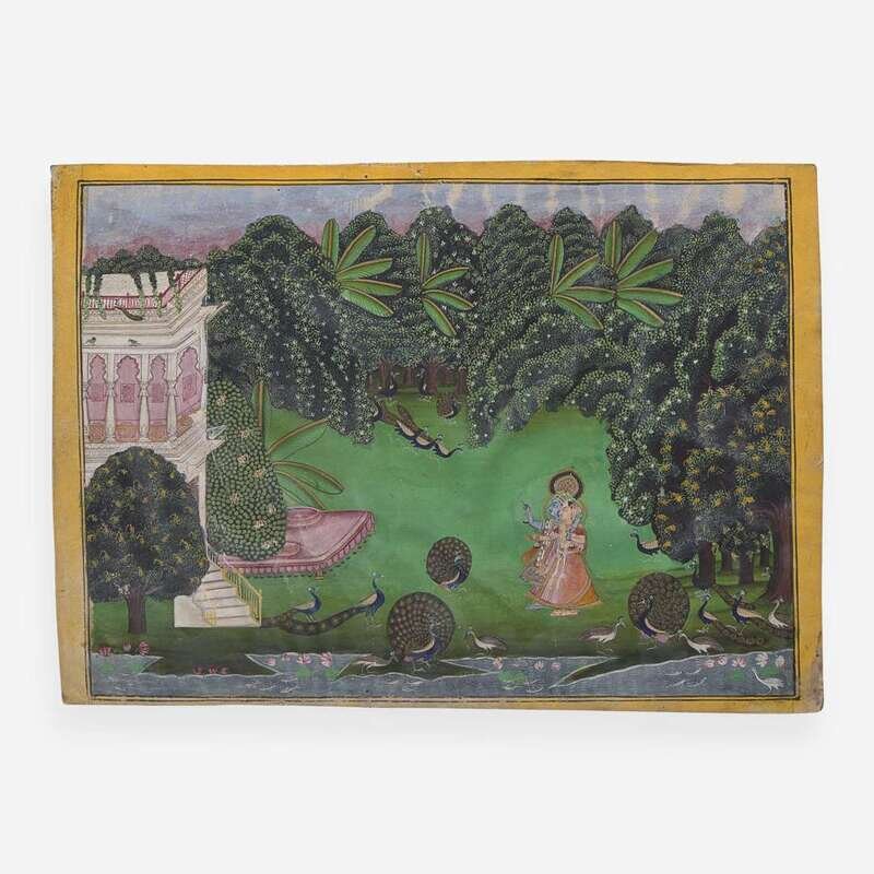 Opaque watercolors with gold; The first, probably Nathadwara, circa 1800-1825, depicting Krishna as Shri Nathji, playing his flute to gopis in an elaborate stylized landscape with monkeys, birds and cattle; the second, possibly Mewar, 19th century, depicting Krishna strolling with Radha in a lush landscape with peacocks and pavilion. Framed and glazed.