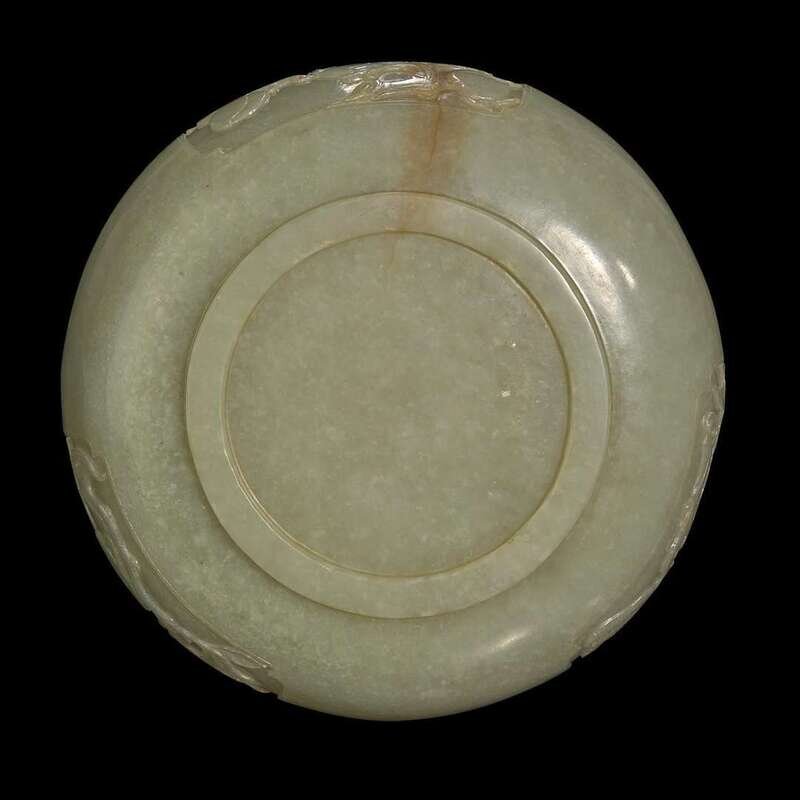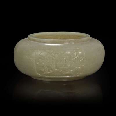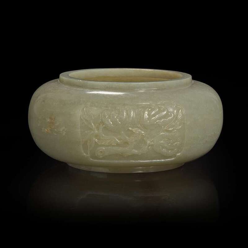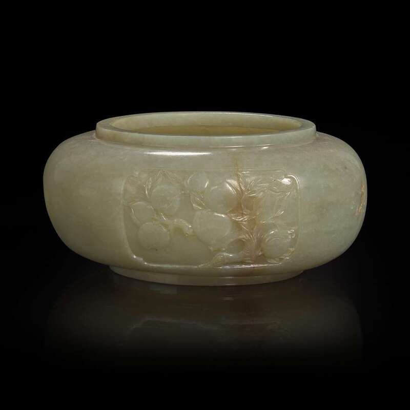 Of compressed globular form with straight collar and foot, the body carved with three reserves of peaches, pomegranate and Buddha's-hand citron, the stone of a pale flecked celadon tone with a russet fissure and an inclusion.