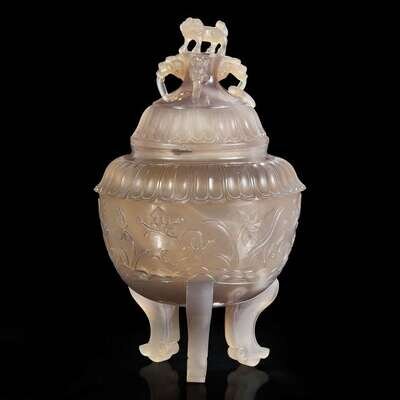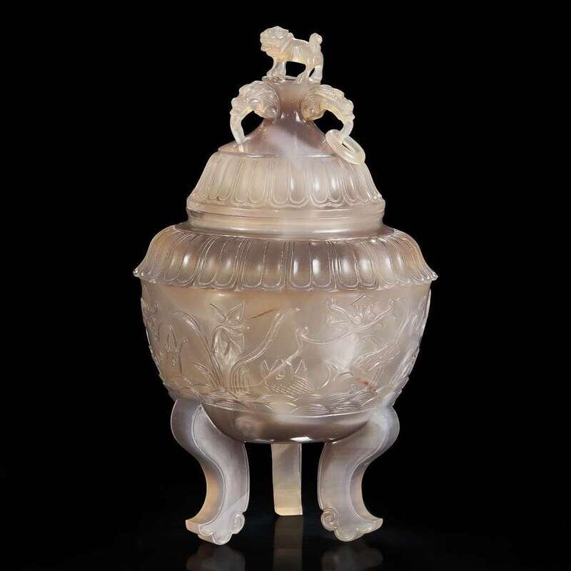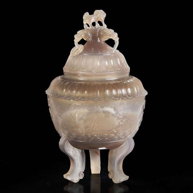 A Chinese carved agate censer and cover 玛瑙带盖香炉
