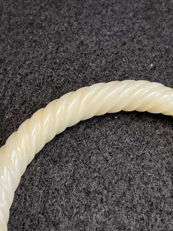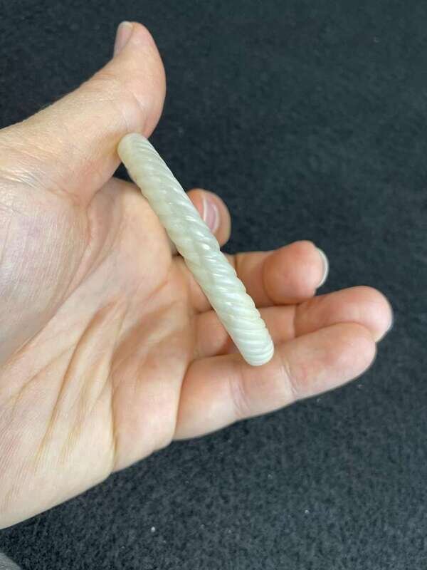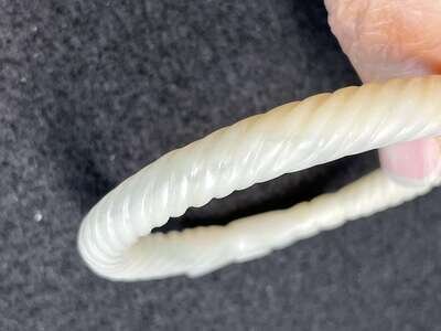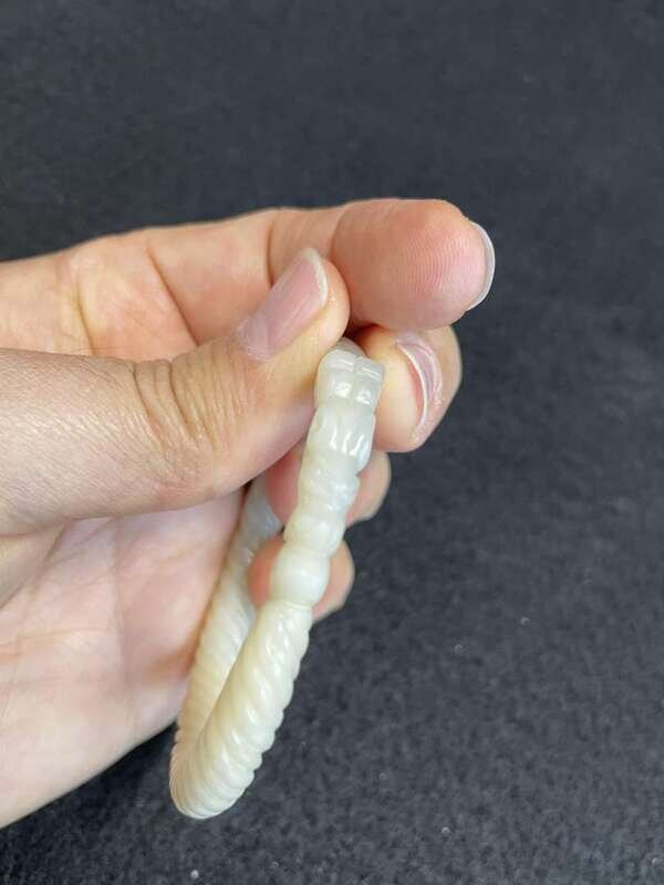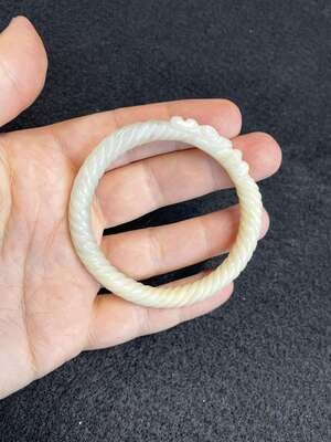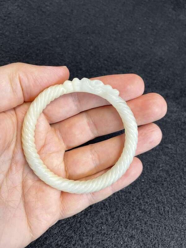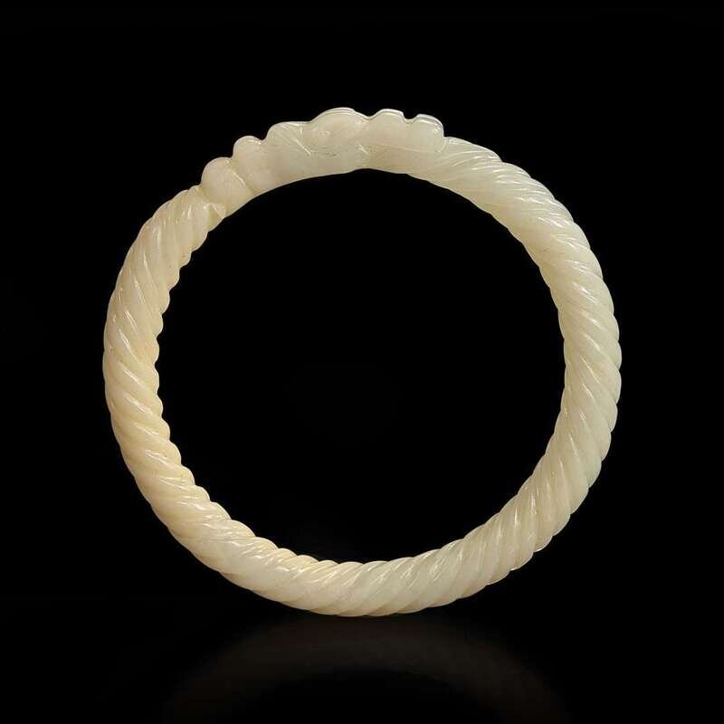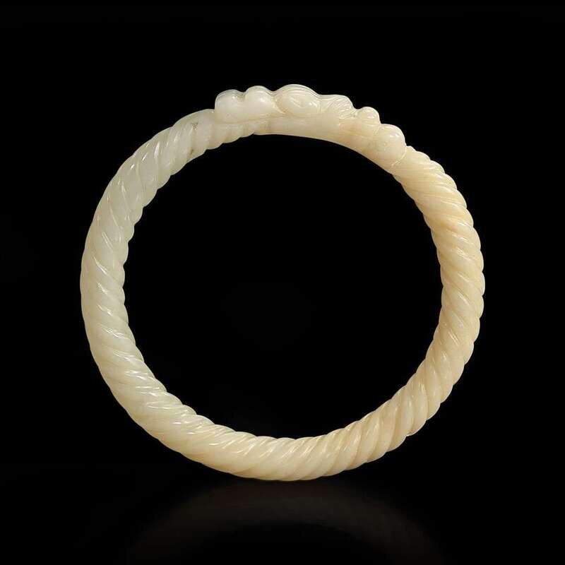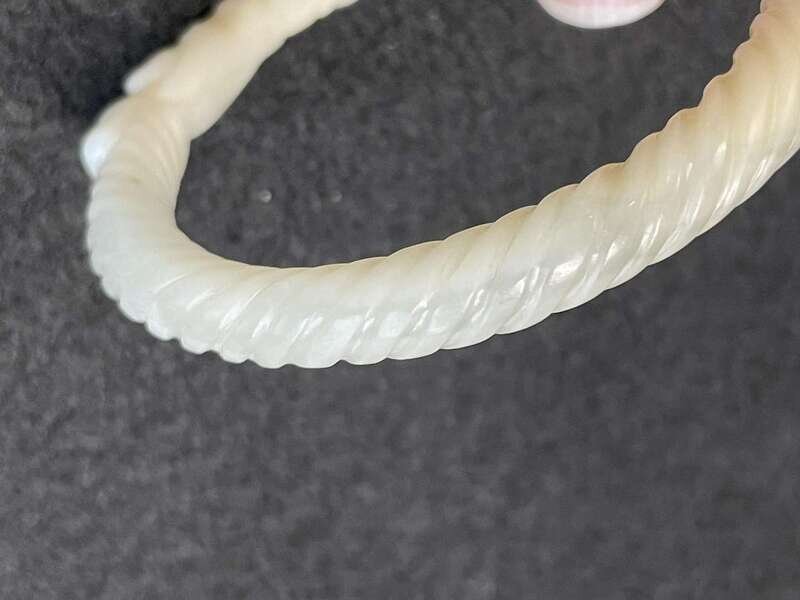 Of "rope-twist" form, one end with dragon head and "pearl", the stone of a slightly varied creamy tone; soft, silky polish.