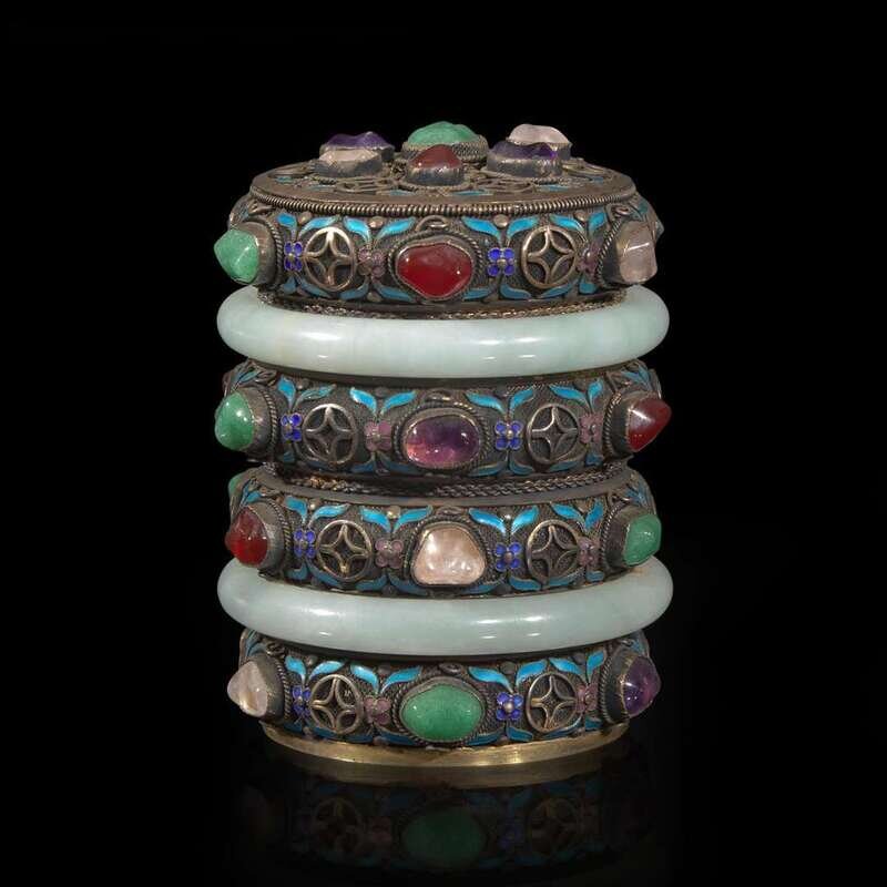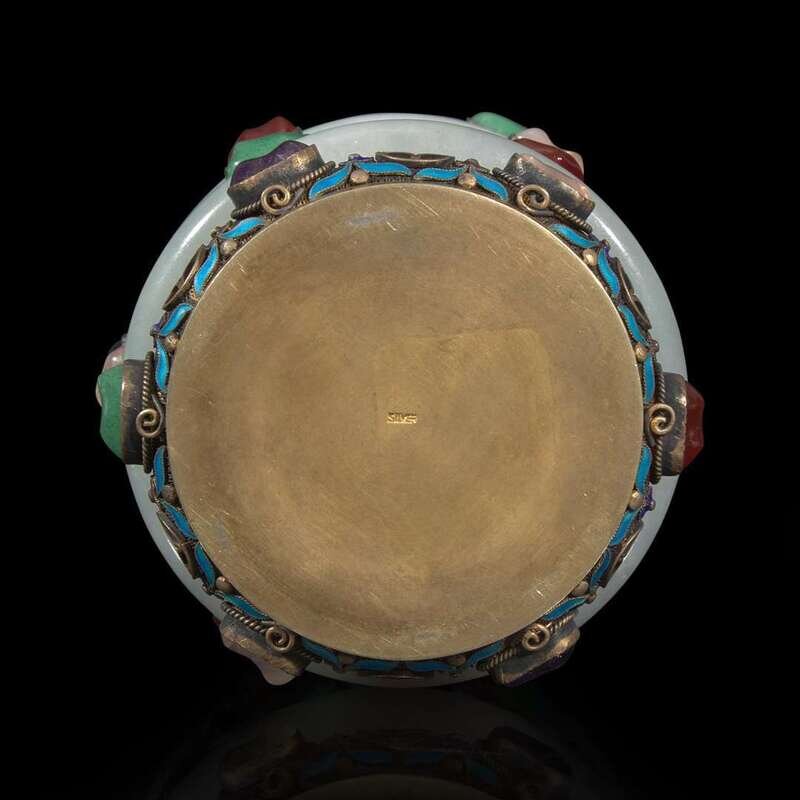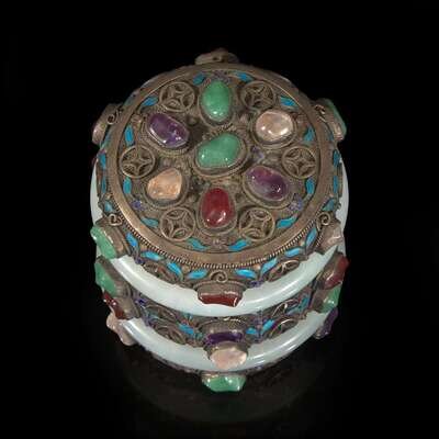 A Chinese jadeite and hardstone-embellished silver box and cover 翡翠宝石镶嵌银盖盒 20th century ????