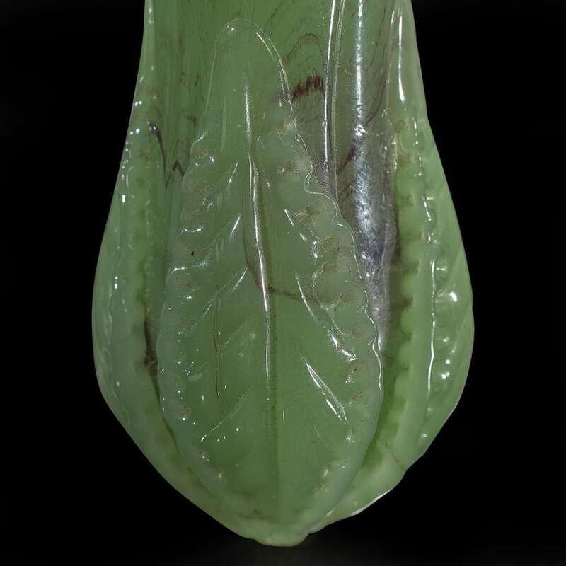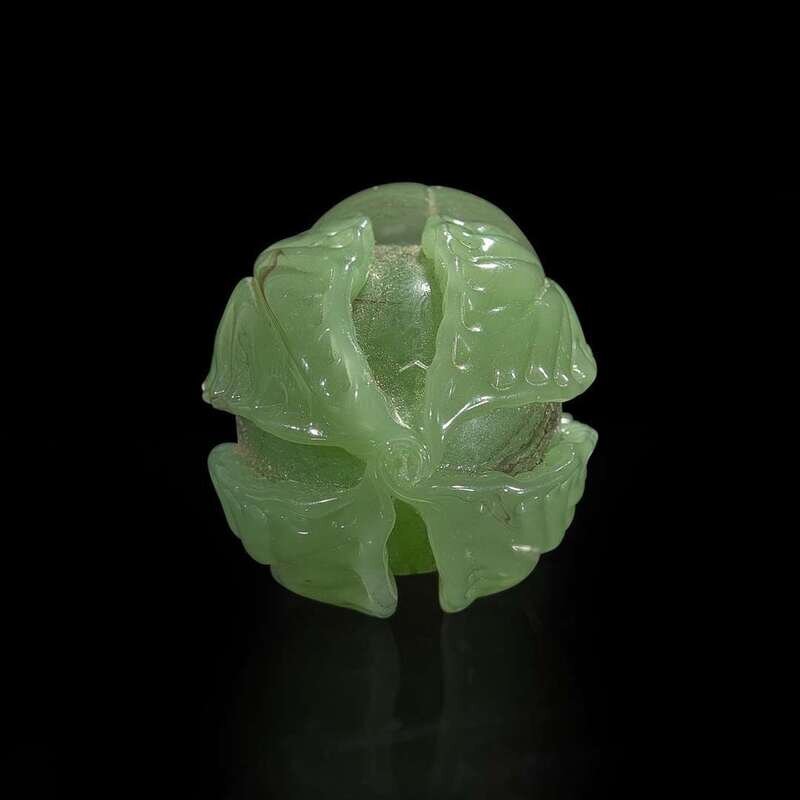 Modeled as a loofah with four lively leaves covering the underside, the finial of prickled cone shape; the glass of green tone with black streaks.