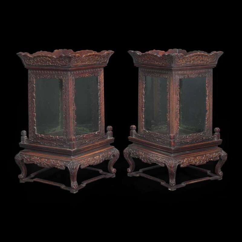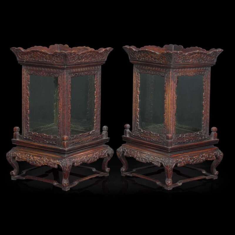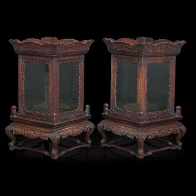 A pair of Chinese carved hardwood lanterns or small vitrines 硬木灯笼一对