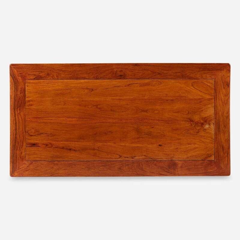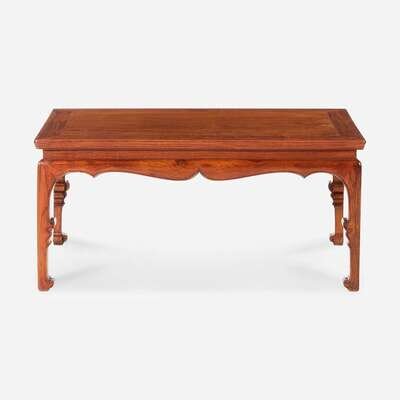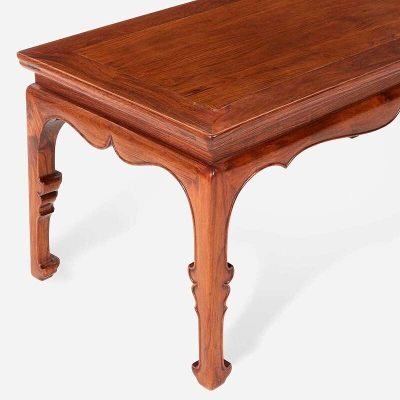 The timber, possibly huanghuali, with a rich honey-brown tone and dense feathered grain; the rectangular top above a recessed waist over a scalloped skirt, raised on scroll-bracket legs and scrolled feet.
