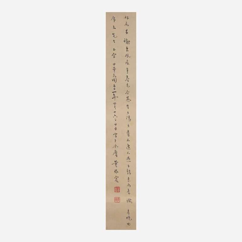 Ink on paper, inscribed lower left and with two seals, dated Minguo 51st year, equivalent to 1962, and dedicated to Xi Wen (Dr. Nathan Sivin), mounted as a hanging scroll.