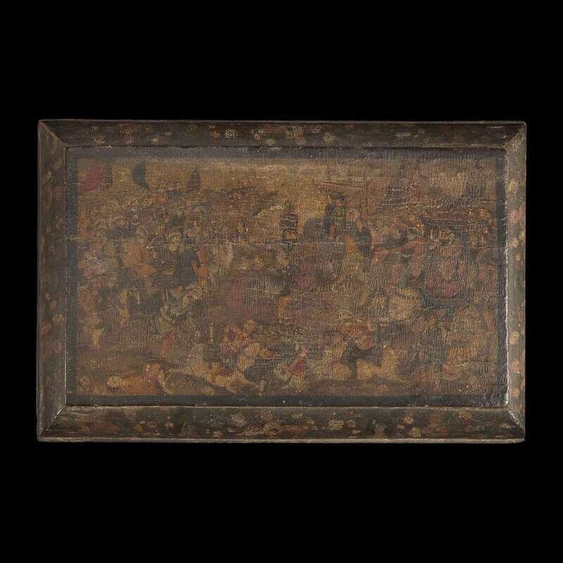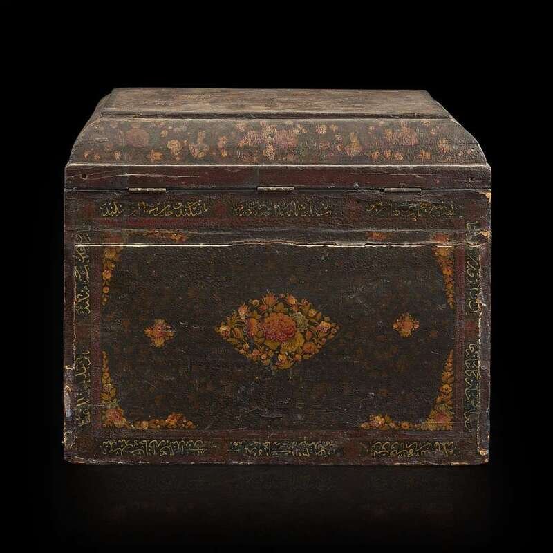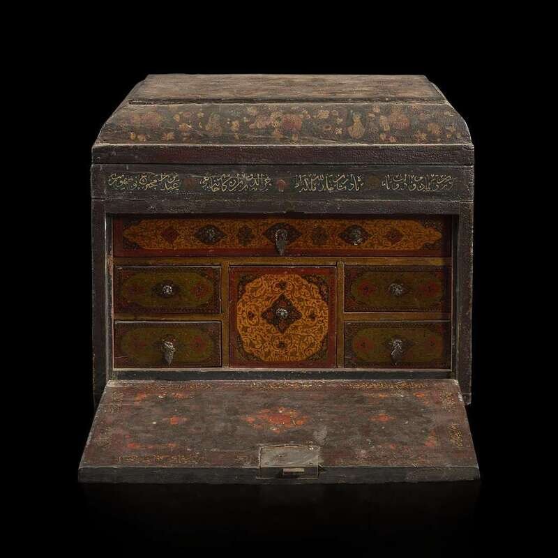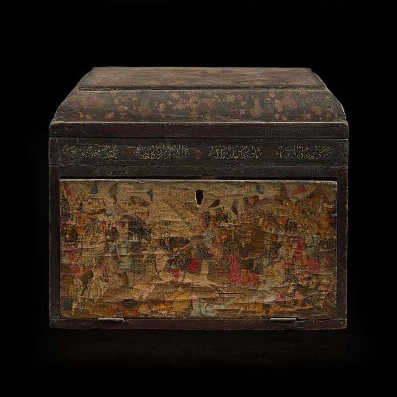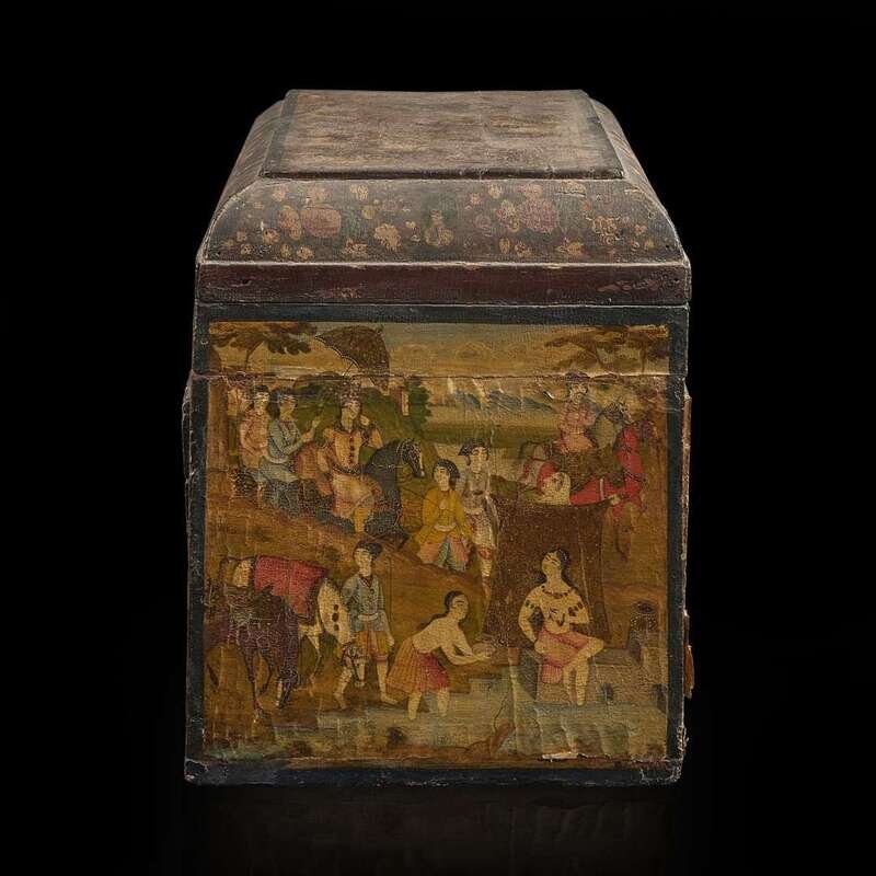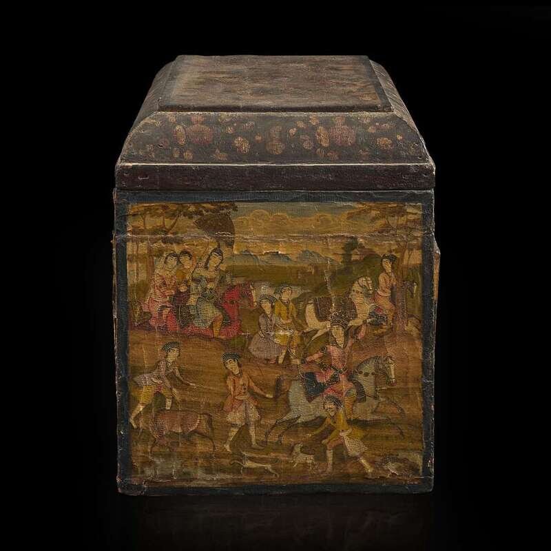 The rectangular chest with hinged cover with curved sides, over a fall front, opening to reveal one long drawer over five arrayed drawers decorated with cartouches and scrollwork; the top of the chest and the front depicting battle scenes, the first possibly depicting Nader Shah, founder of the Afsharid dynasty of Iran, defeating the Mughal forces of Muhammed Shah at the battle of Karnal in 1739, one side of the chest painted with a mounted bejeweled lady and companions, admiring the hunting prowess of a prince, possibly depicting an episode where Bahram Gur pins a leg of a gazelle to its ear with an arrow, the other side panel painted with a prince and his retinue coming upon a bejeweled lady bathing in a stream (likely Khusraw discovering Shirin bathing); the back and the interior of the fall front with floral cartouches and calligraphic border reserves., the sides of the cover with portrait cartouches and flowers.