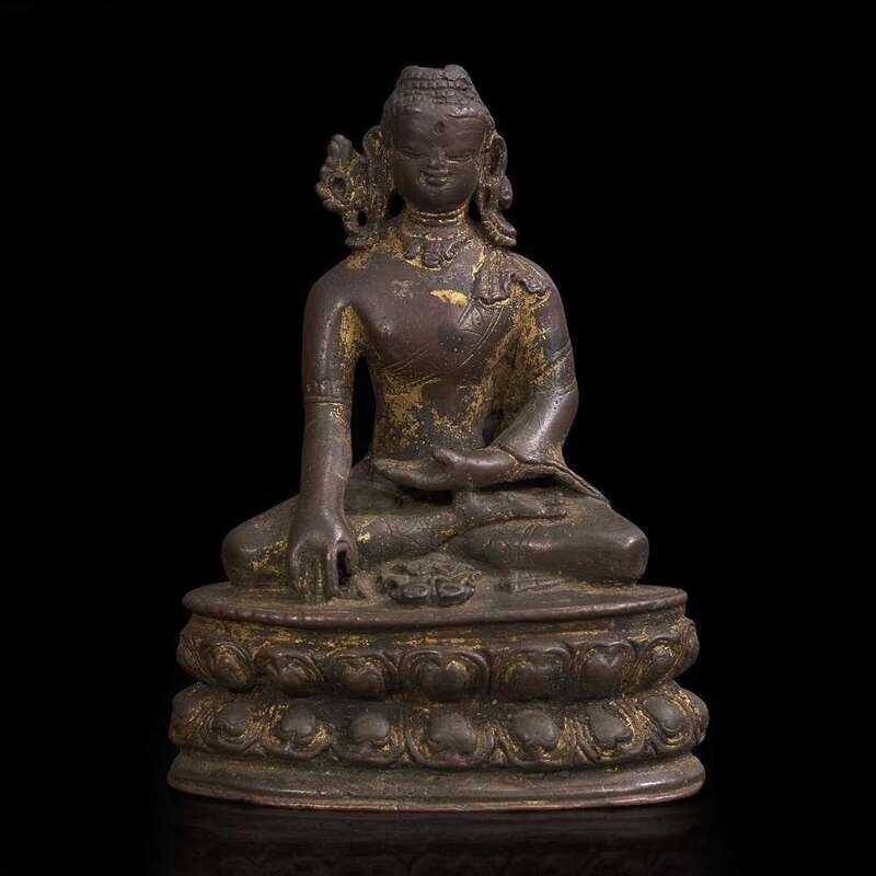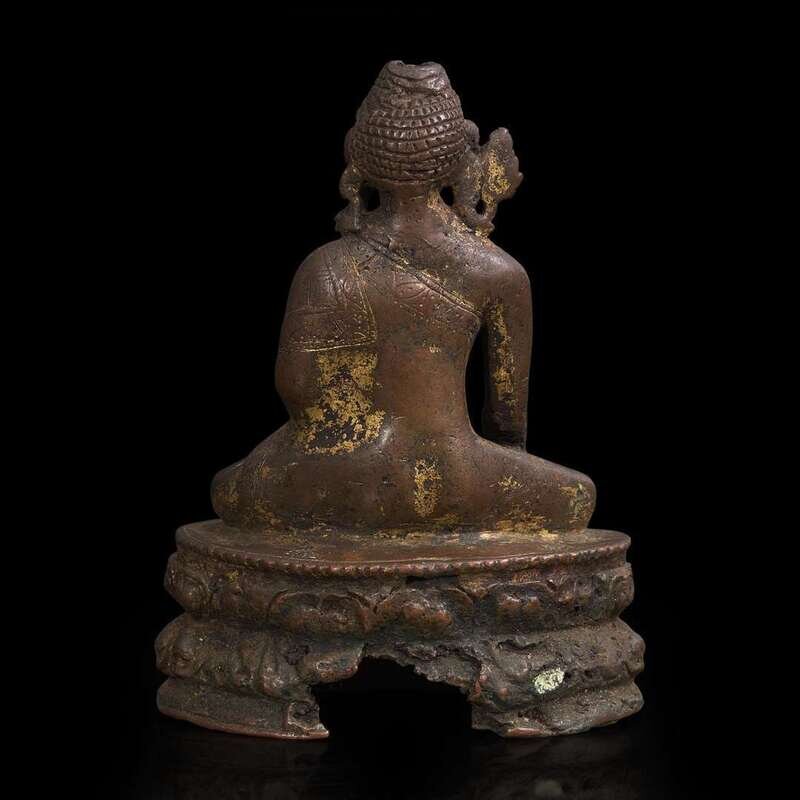 Depicted seated with hand in bhumisparsha mudra, a vajra placed before the figure, seated on a double-lotus throne, traces of gilding.