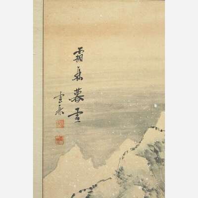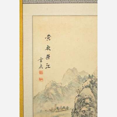 Each panel with a mountainous river landscape, ink and color on paper, inscribed and with two seals upper left; brocade fabric and paper mounts.
