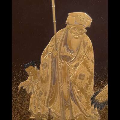 The slightly arched screen decorated on one side with Jurojin, attendant and crane, above a prunus branch reserve, within a surround with two dragons chasing a pearl above waves, ho-o birds inside the scrolled upright supports, the reverse with a Chinese style mountainous landscape with pavilions and waterfall, above a reserved bamboo panel, bordered by stylized lotus scrolls. Underside with applied U.S. Customs label, possibly for the Louisiana Purchase Exposition (St. Louis World's Fair) of 1904, numbered 867(?) and with additional label "H-121". With a later fitted cover.