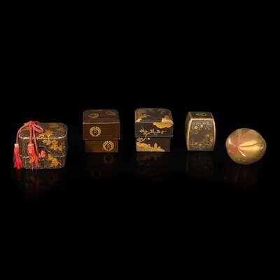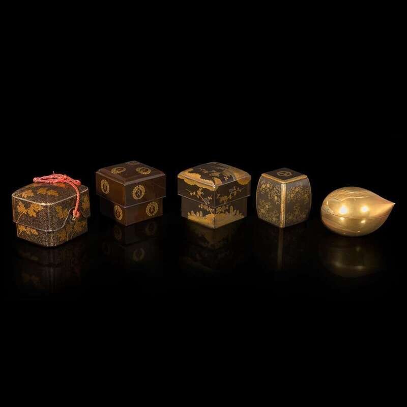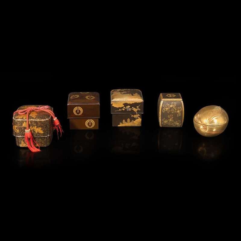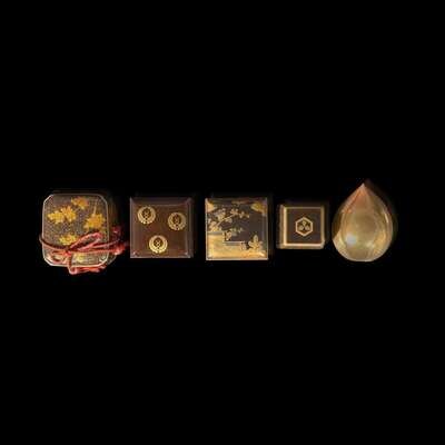 Comprising a covered box decorated with togidashi plants; two square covered boxes decorated with gold hiramaki-e; a peach form covered box with raised leaves; and a smaller incense game censer box with hiramaki-e decorations.