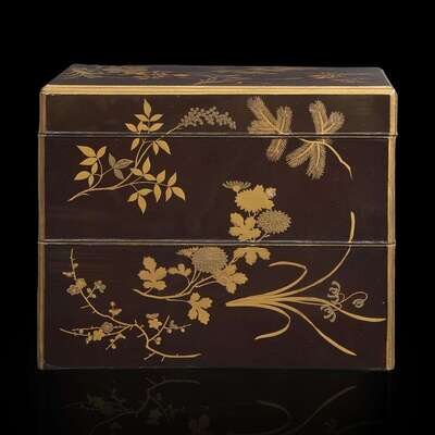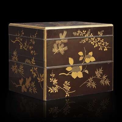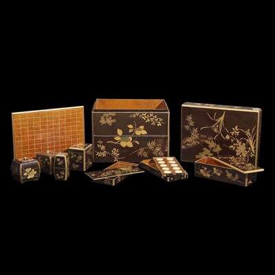 Decorated with hiramaki-e blossoms of orchid, chrysanthemum, pine, peony, and bamboo to the cover; all against a roiro ground; the fittings including two small censers, an ink stone box and internal cover, a two-tier mother of pearl-inlaid inlaid stand; a grid game board, a slip box, and two more additional rectangular boxes.
