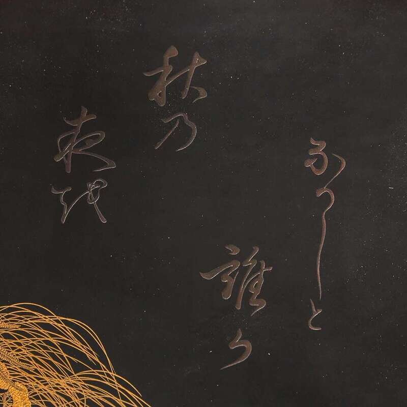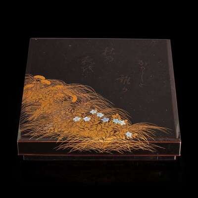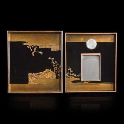 The cover depicting flowers inlaid with mother of pearl among autumn grasses, and calligraphy which may be translated as: “Who are they meeting on an autumn night?"; the interior decorated with plants and stylized landscape with sedan chair, all executed in hiramaki-e against the black roiro ground; fitted with an ink stone, underside signed Kin’ei Saku (made by Kin’ei), and a silver water dropper in the form of a full moon.