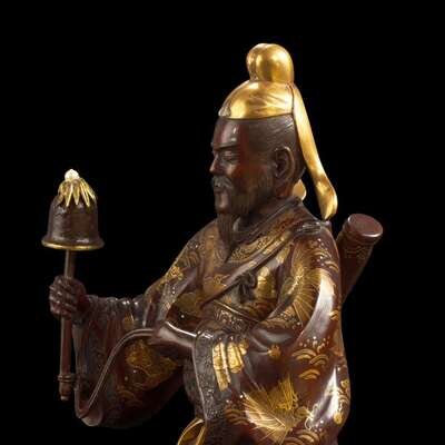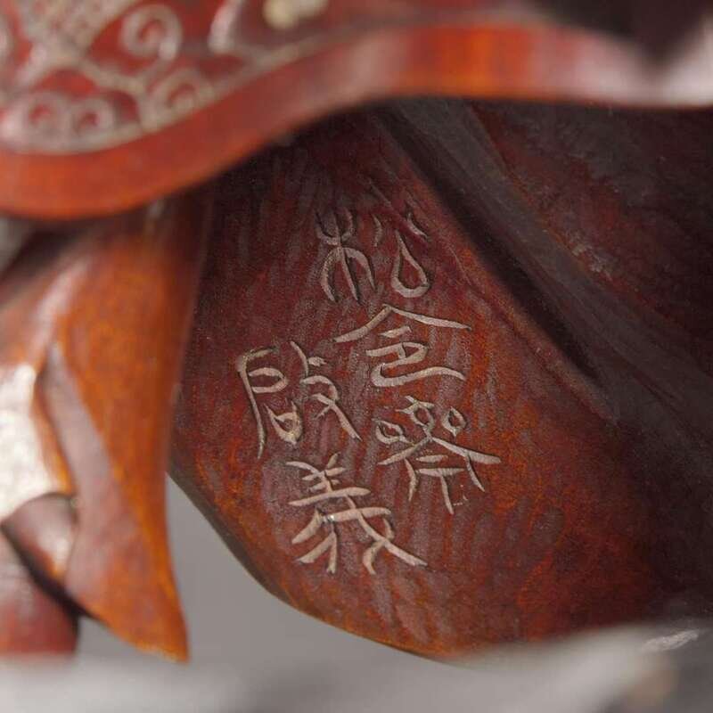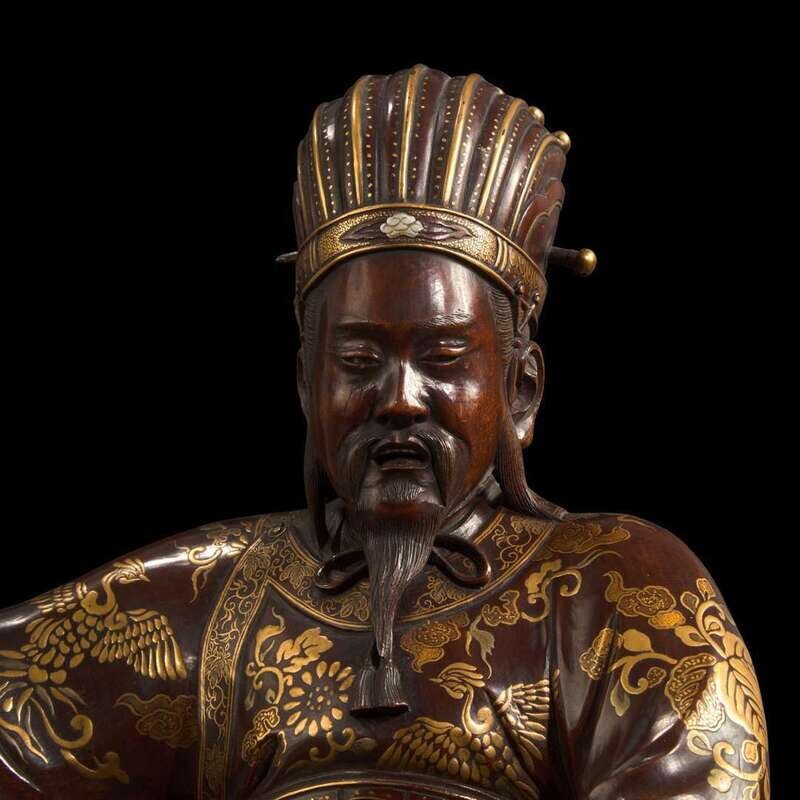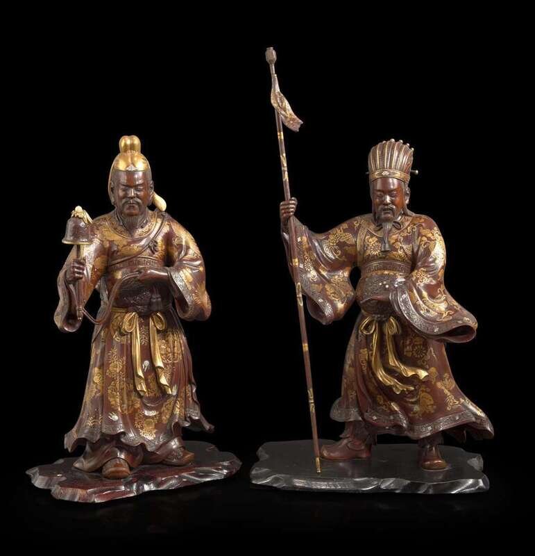 One figure wearing an official Chinese-style headdress holding a long pennant in one hand, his robe decorated with gilt lacquered floral and phoenix motifs, with a low relief shishi to the front and a dragon to the back of his girdle, their eyes, claws and inlays to his hat and sleeve-hems embellished with mother of pearl, interior of his robes signed Shokaisai Takayoshi (?); the other figure wearing a gilt lacquered scholar's headdress centered by a mother of pearl embellishment, similar decoration of floriform medallions, flaming pearls, and winged dragons to robe, holding a bell-form object, and carrying a scroll-case on his back; both on wood stands.