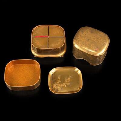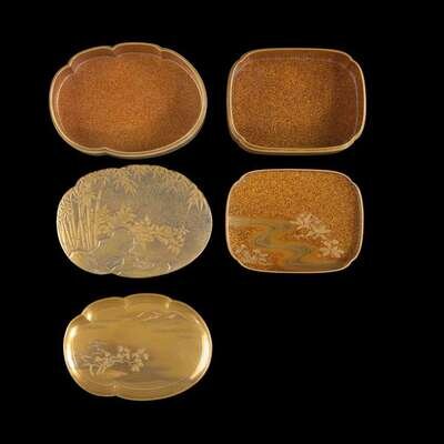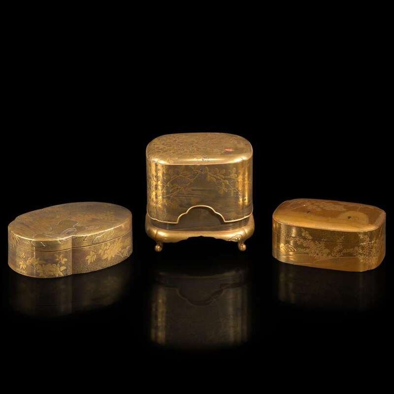Comprising a tall lacquer incense game box of gold and silver hiramaki-e plants against hirame kinji ground, with a deep cover, the interior with a fitted tray and four smaller boxes on a divider; a shaped oval box decorated with bamboo, peonies, and rocks, the interior with a fitted tray depicting a misty shoreline; a hiramaki-e and kirikane-lobed rectangular smaller box, decorated with standing drum behind a curtain in a landscape, the interior of the cover applied with togidashi river and hiramaki-e flowers.