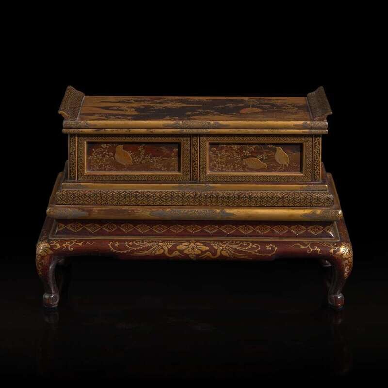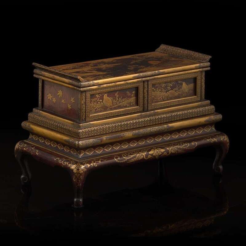 In two parts, the upper part with a pair of drawers with gold lacquered quail in a landscape, the top decorated a screen in a landscape; the lower section raised on cabriole legs, decorated with ho-o birds to the front, floral vines and spray motifs to all corners, beneath gilt brocade motif.