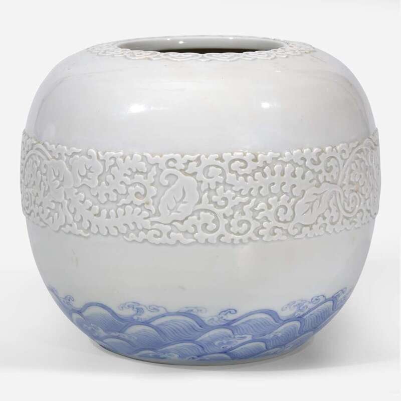 A Japanese blue and white porcelain water jar 日本青花模印罐 20th century ????