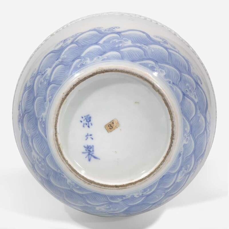 Probably Hirado, the rim decorated with intricate molded cloud scrolls, various floral and foliage band motif to waist, blue and white painted waves to the lower register; underside with blue and white three-character mark.