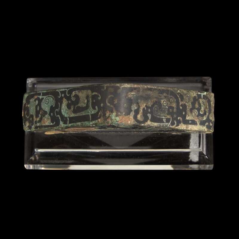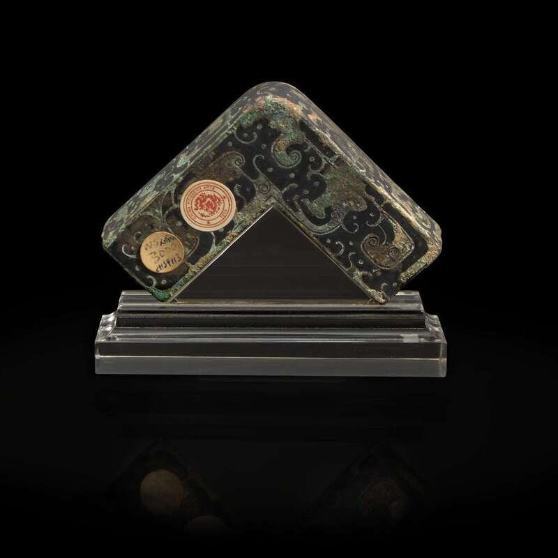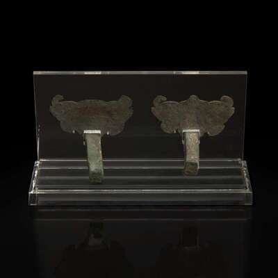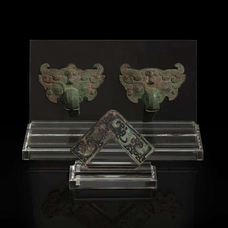 Comprising a pair of stylized mask fittings, "Pushou", possibly Han dynasty, and an inlaid bronze angular fitting, Eastern Zhou or later; all with later acrylic stands.