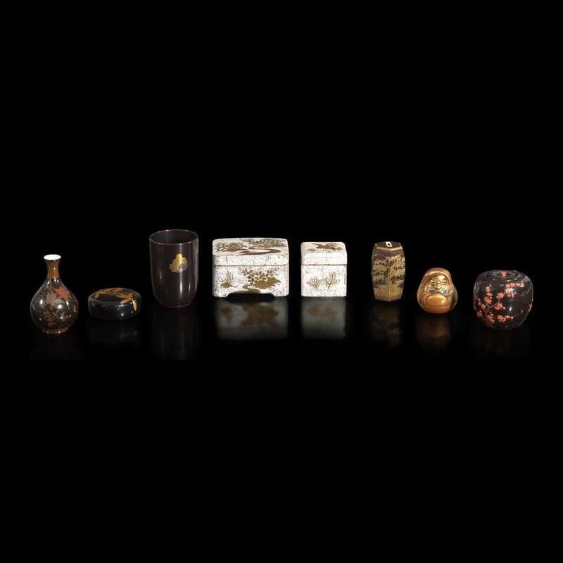 Comprising: a water dropper decorated with orchid blossoms, signed Shunkosai, a raden-inlaid "eggshell" lacquer rectangular box, a similar small square box, a hexagonal incense game slip container box, a small orange hardstone-embellished "prunus" natsume, a small cloisonné-enameled porcelain vase, signed, a cup with hiramaki-e Hotei against a roiro ground, and a Daruma-form figural box.