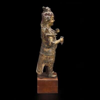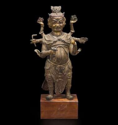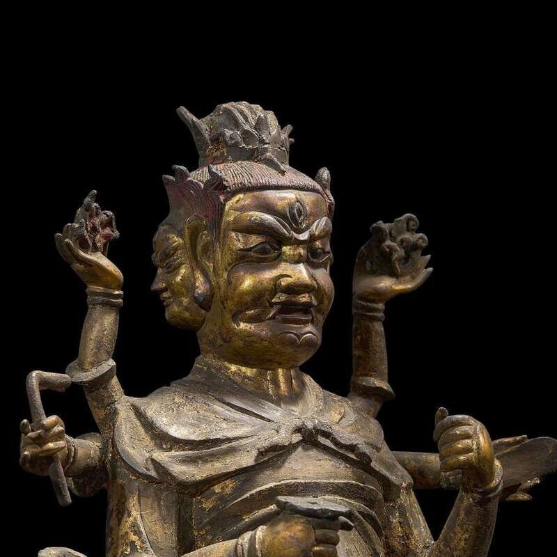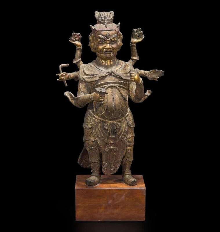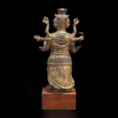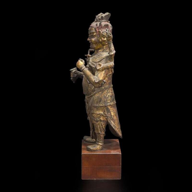 The standing figure depicted in armor and flowing robes, with three faces and six arms bearing various implements. The faces and hands gilded, the body and hair gilt and polychrome-lacquered, on a modern wood stand