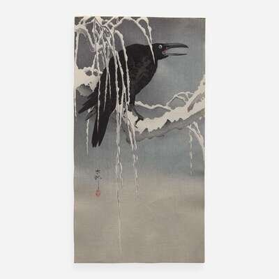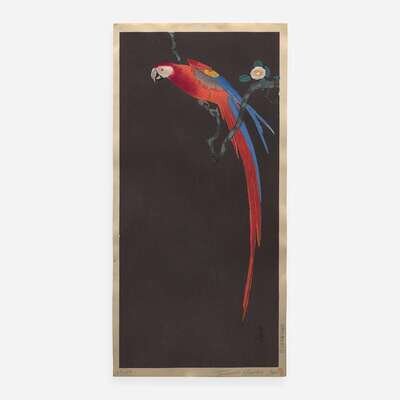 Ohara Koson (1877-1944), “Crow on Snowy Branch” and Tokutaro "Kakunen" Tsuruoka, “Macaw”, incorporating metallic inks, signed and dated 1940 in pencil lower right, numbered 56/100 lower left, framed, matted and glazed.