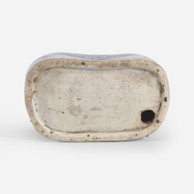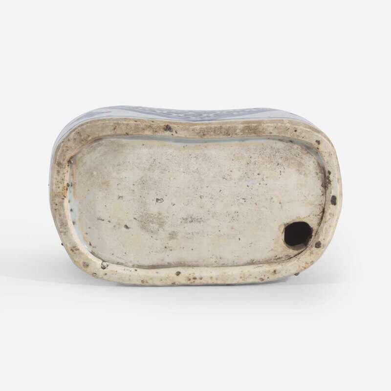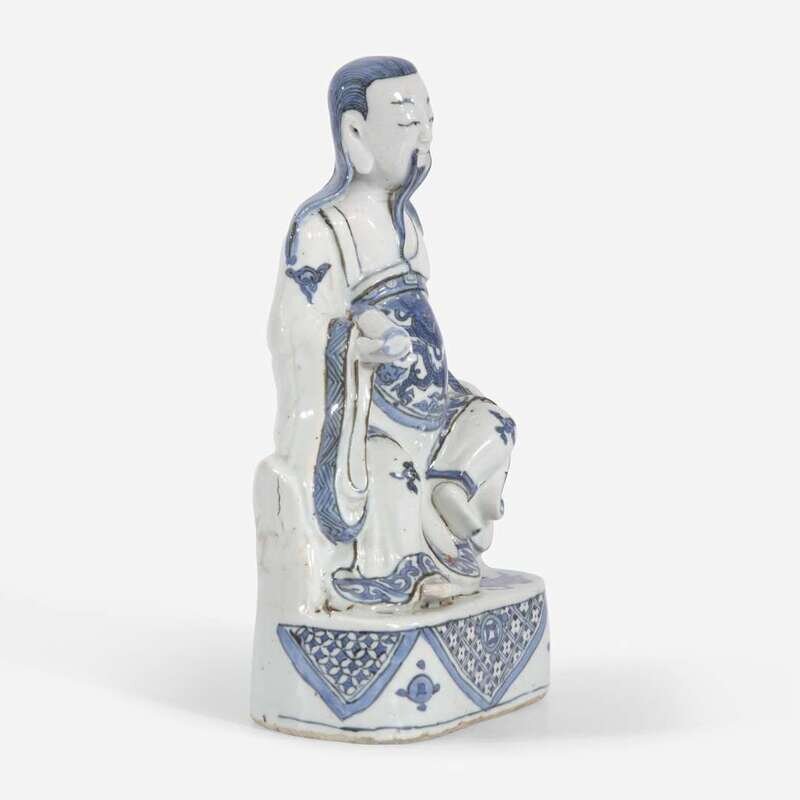 The seated figure with long hair and beard, in flowing dragon robe, holding a scroll in his left hand, a serpent-entwined tortoise painted on top of the base, sides of base further decorated with diaper-decorated "draperies"