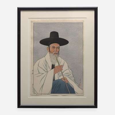 Woodblock printed in colors, with gauffrage, from the edition of 300. Framed, matted and glazed.
