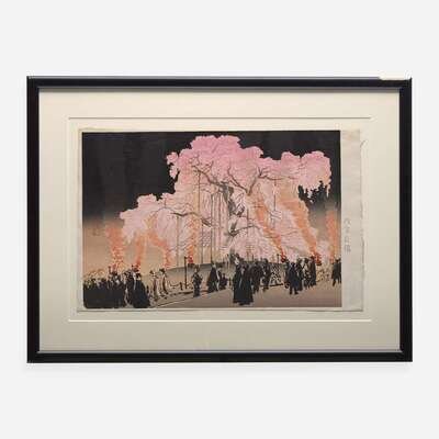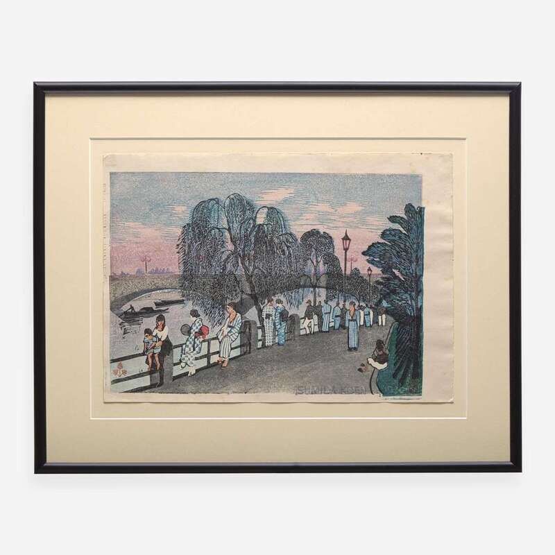 Kazuma Oda (1882-1956), “Sumida Koen, Summer Evening” and Yoshiwara Kanpo (1894–1979), “Cherry Blossoms at Night, Maruyama Park”, red "Sato" seal verso. Framed, matted and glazed.