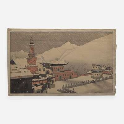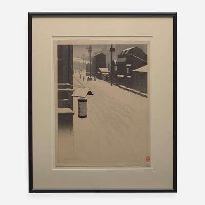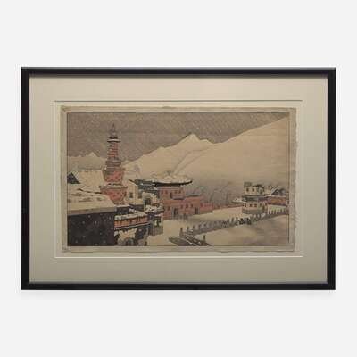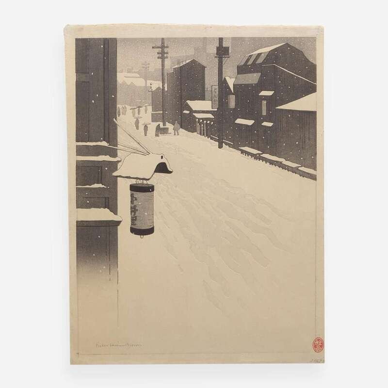 “Tokyo in Snow”, 1936, signed in pencil lower left and with seal lower right, and “Jehol in Falling Snow”, signed in pencil lower right. Both framed, matted and glazed.