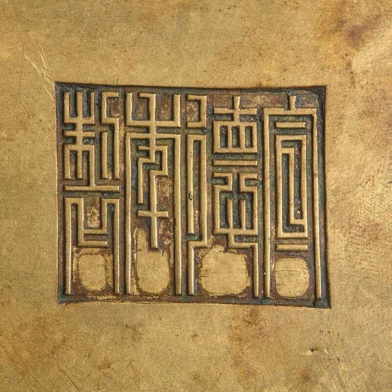 Of impressive weight, with loop handles at the shoulder, underside with four-character seal mark; with slightly oxidized golden surface, attractive crystalline matrix to the metal, approximately 4154g.