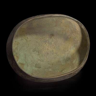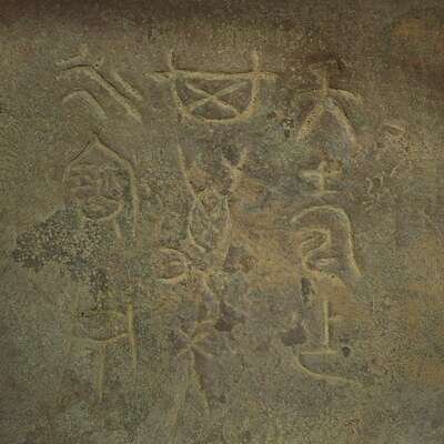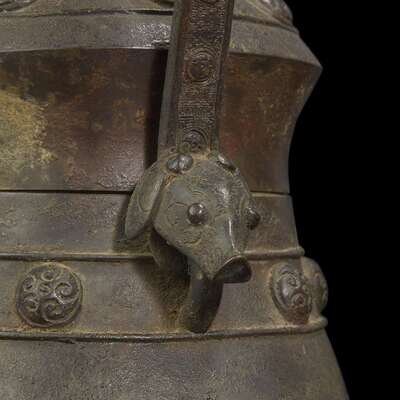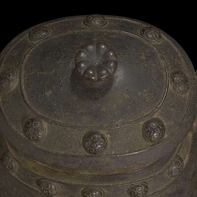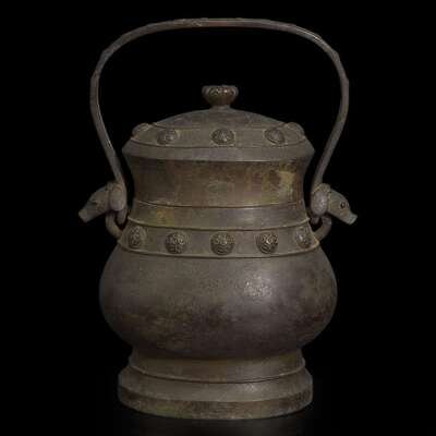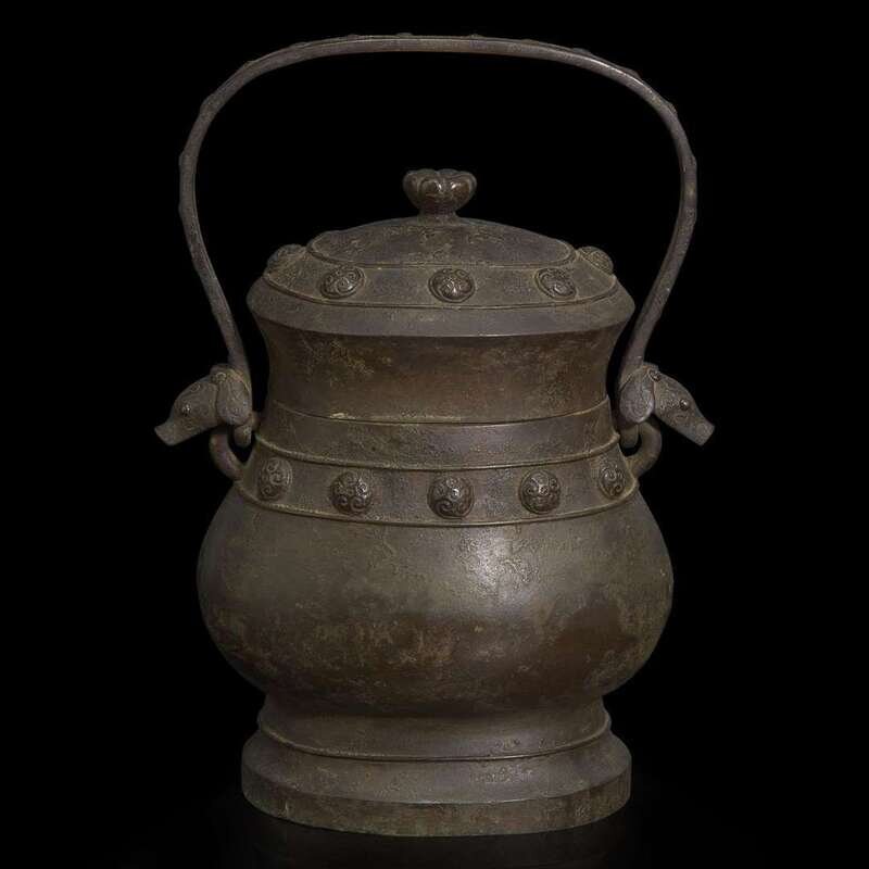 The swelling Eastern Zhou-style vessel with flared cover, with floriform knop, the arched handle terminating in porcine heads, stylized roundels to shoulder and cover, underside of cover with six-character archaic inscription