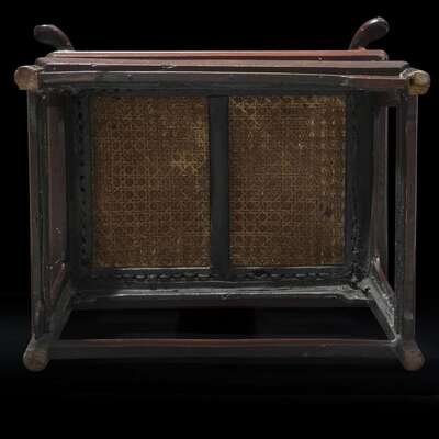 With continuous scrolled back, over a serpentine splat carved with dragon roundel, caned rectangular seat, over shaped spandrels and box stretcher.
