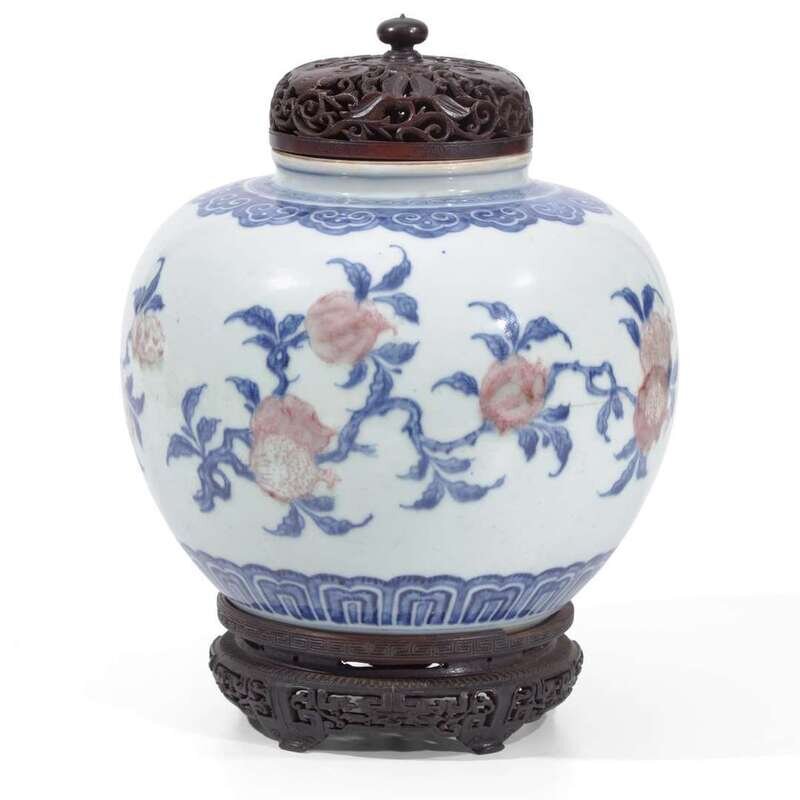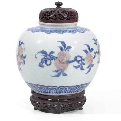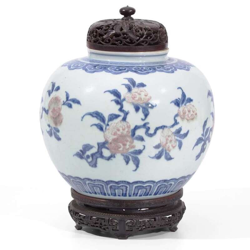 A Chinese underglaze blue and red porcelain jar 清花釉里红三多罐 18th century ????