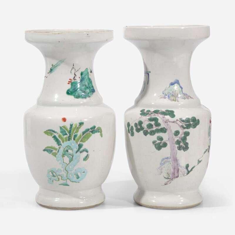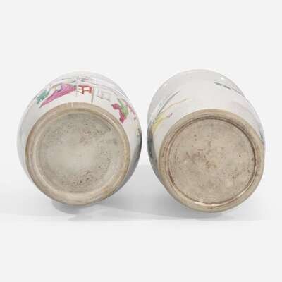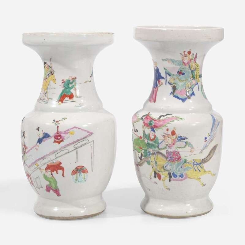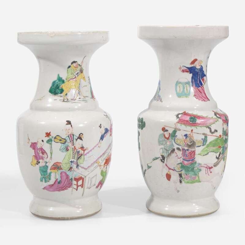 With wide cupped lip, sloping stepped shoulder, one decorated with mounted warriors with attendants, the neck with a seated military commander with subordinate; the other with meiren and four playing boys around a long table, the neck with Shoulao and his deer with an attendant.