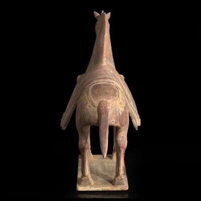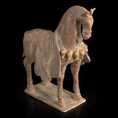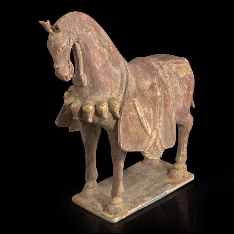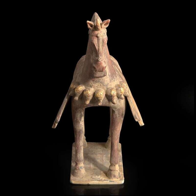 A Chinese painted and parcel-gilt pottery figure of a caparisoned horse 彩绘漆金陶马 Northern Wei dynasty ??