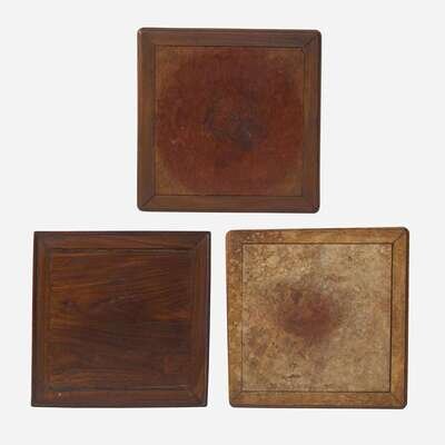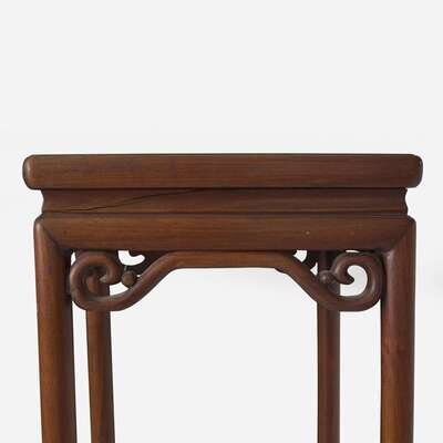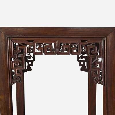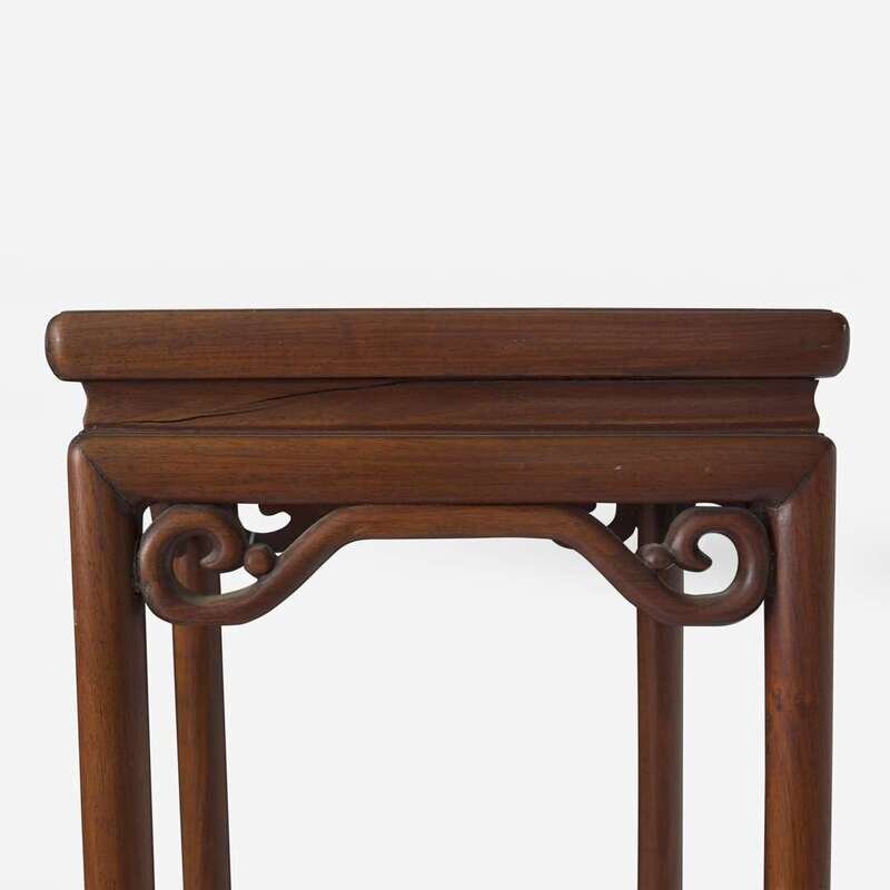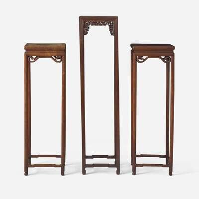 Comprising: A pair of stands with huamu-inset tops, over scrolled skirts, raised on legs of circular section, humpback stretchers at the base; and a single stand with elaborate scrollwork skirt, raised on square legs, humpback stretchers at the base.