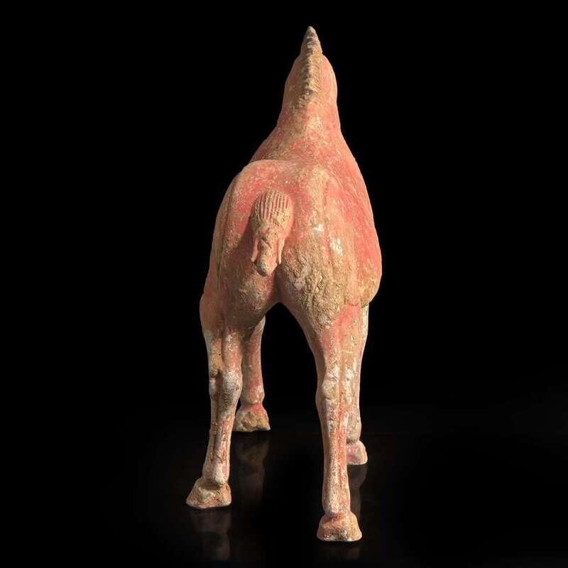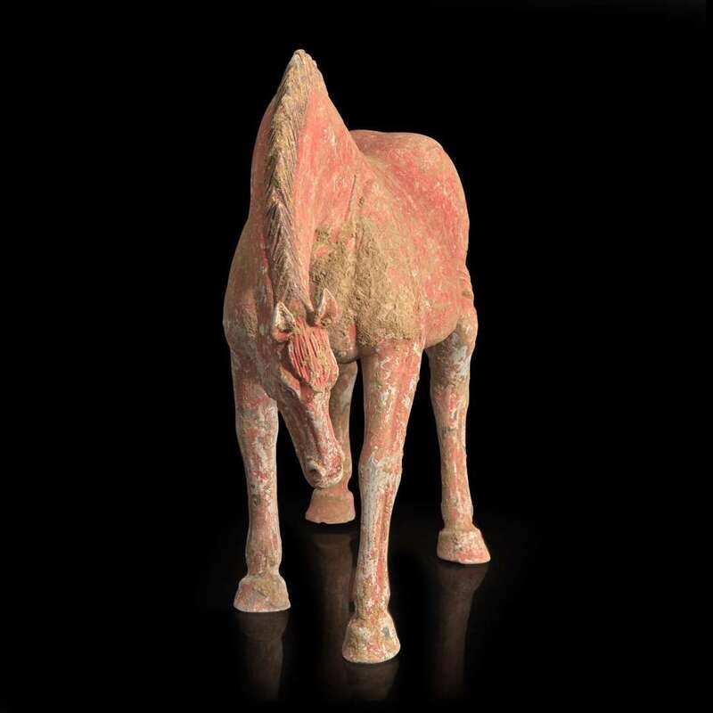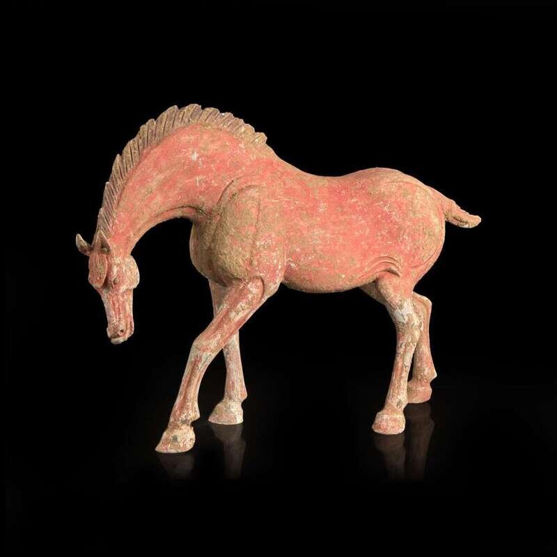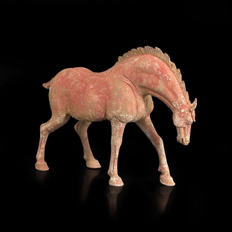 A Chinese red-painted grey pottery figure of a horse with lowered head 红色彩绘陶马 Possibly Tang dynasty ????