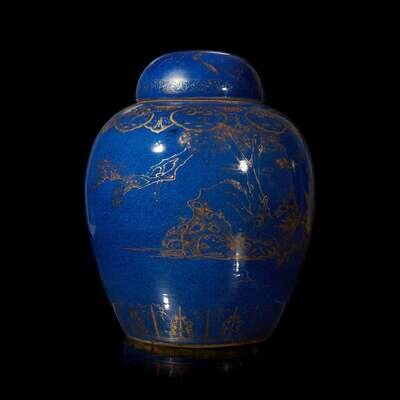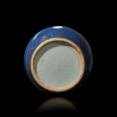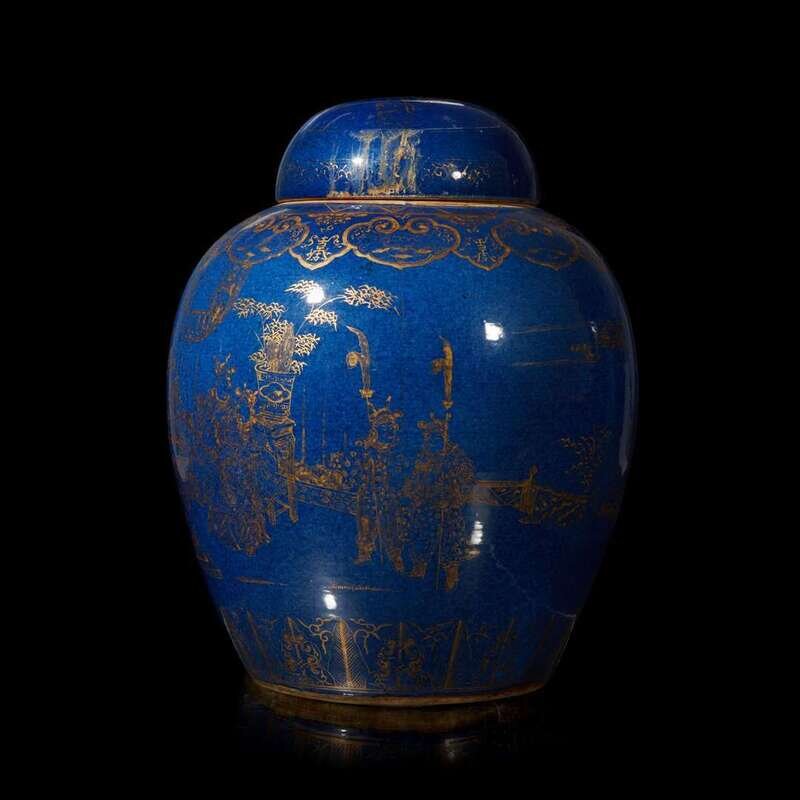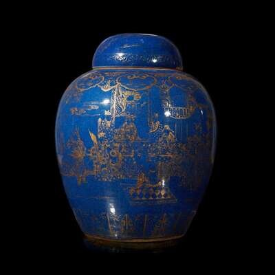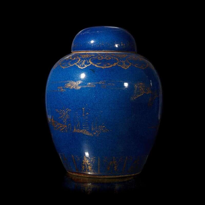 A massive Chinese gilt-decorated powder blue ovoid jar and cover 洒蓝地描金大盖罐 Qing dynasty ?