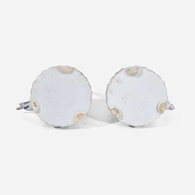 Each of lobed domed form, with tall vertical handle, conforming covers, decorated with floral sprays and rockwork.