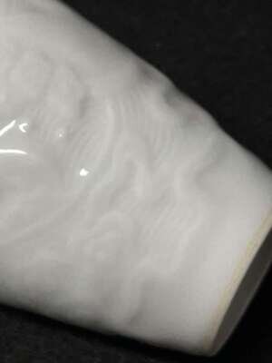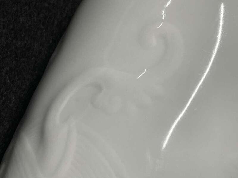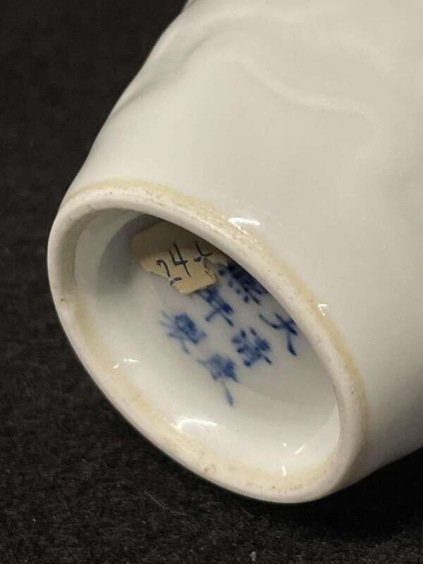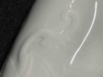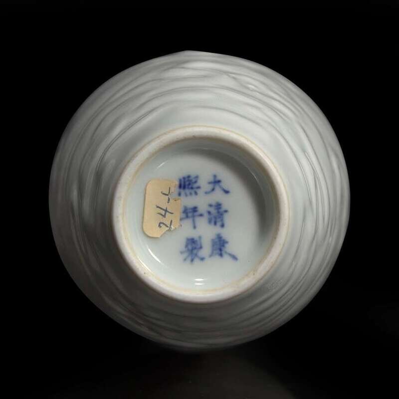 Modeled in low relief with two dragons among roiling waves, underside with six-character mark in underglaze blue.