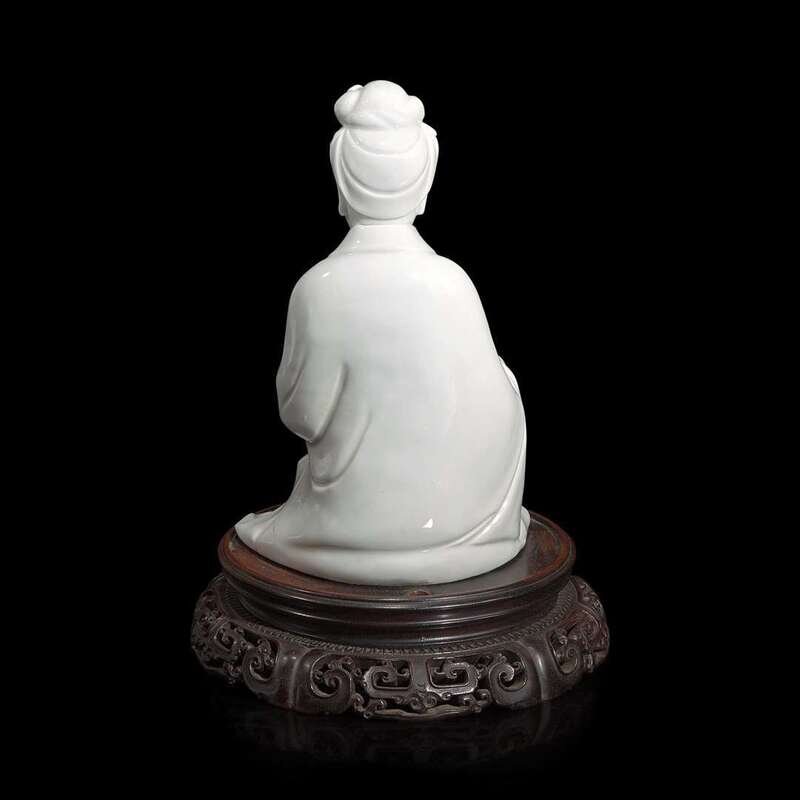 Elegantly modeled, with flowing robes and serene visage, four-character seal mark impressed between her shoulder blades; mounted on a later Chinese carved hardwood stand
