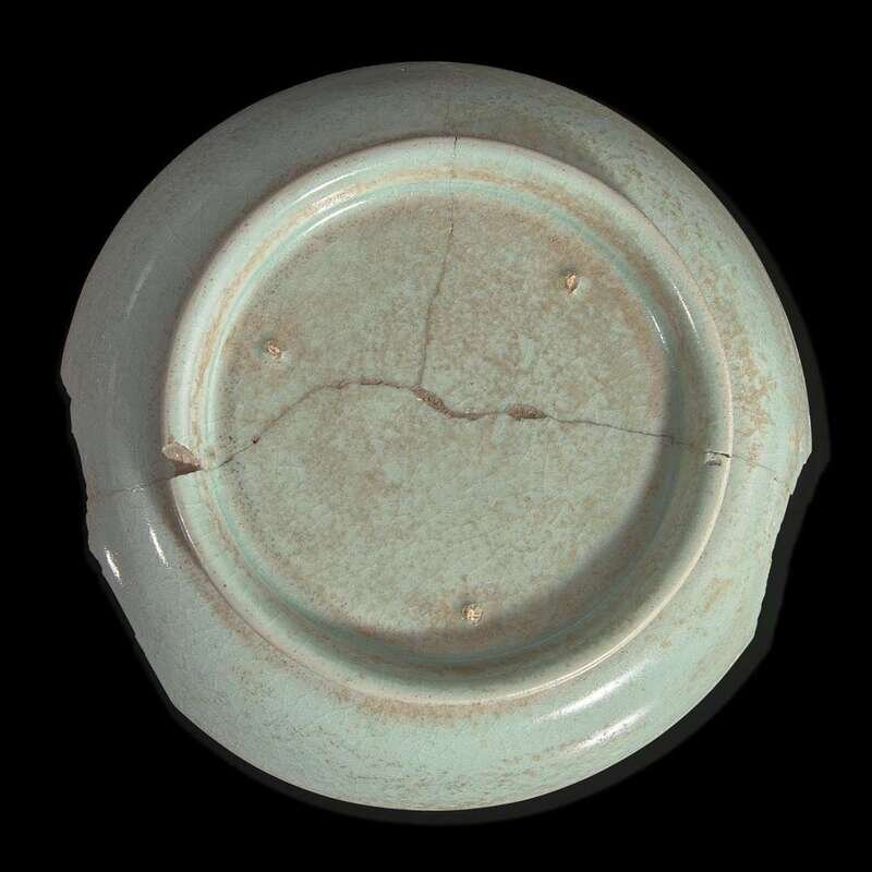 The circular dish with curved sides, spreading foot with curved profile, underside with three "sesame seed" spur marks, the pale blue glaze with fine cracqueleur.