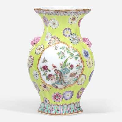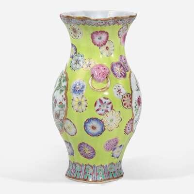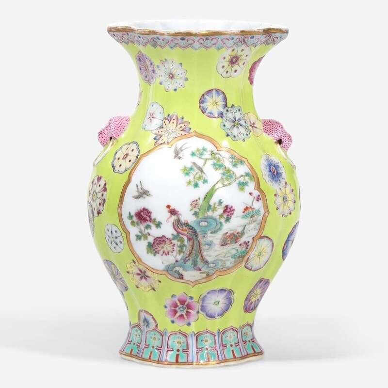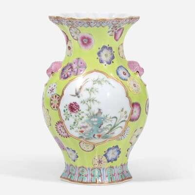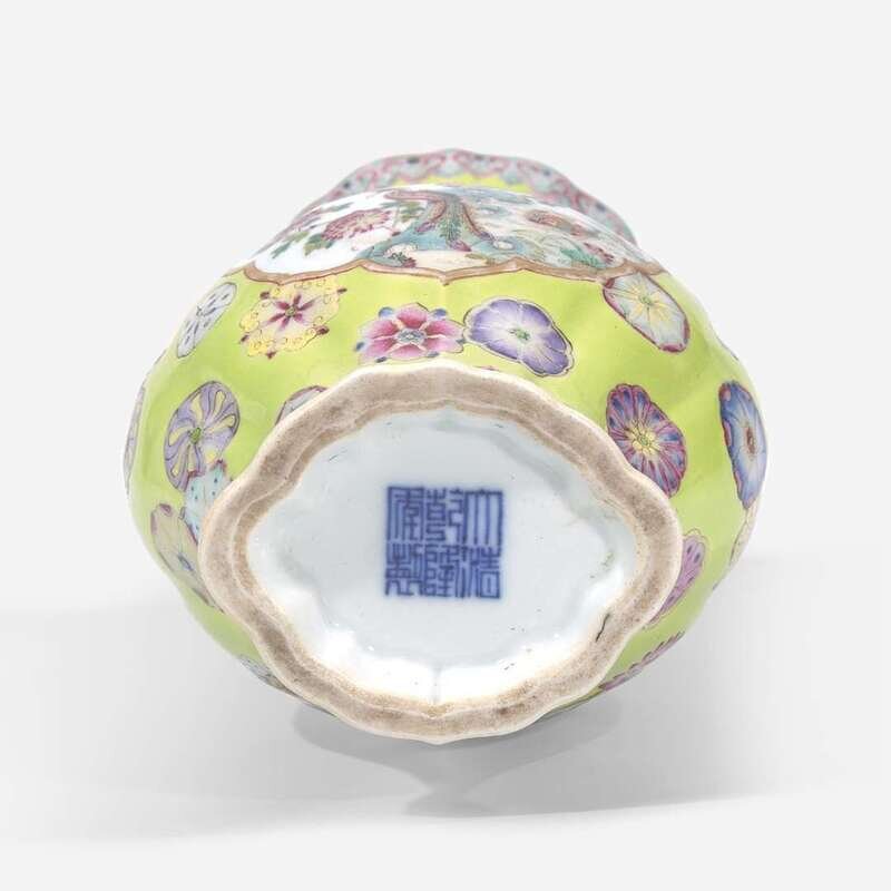 A finely-decorated chartreuse-ground lobed cabinet vase 粉彩黄绿地赏瓶 Qianlong six-character seal mark ?????