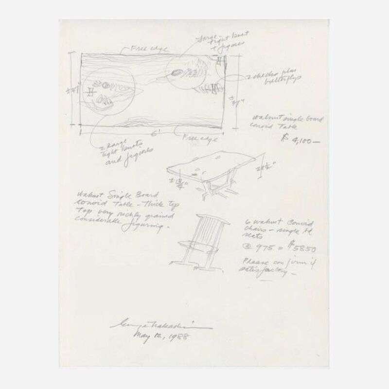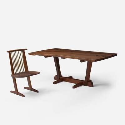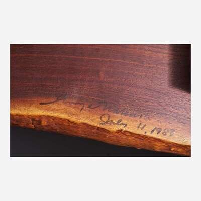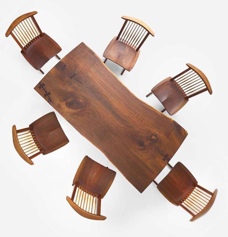 George Nakashima (American, 1905-1990) Fine Single-Board "Conoid" Dining Table and Set of Six Single-Board "Conoid" Dining Chairs, New Hope, Pennsylvania, 1988