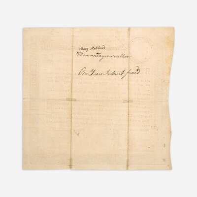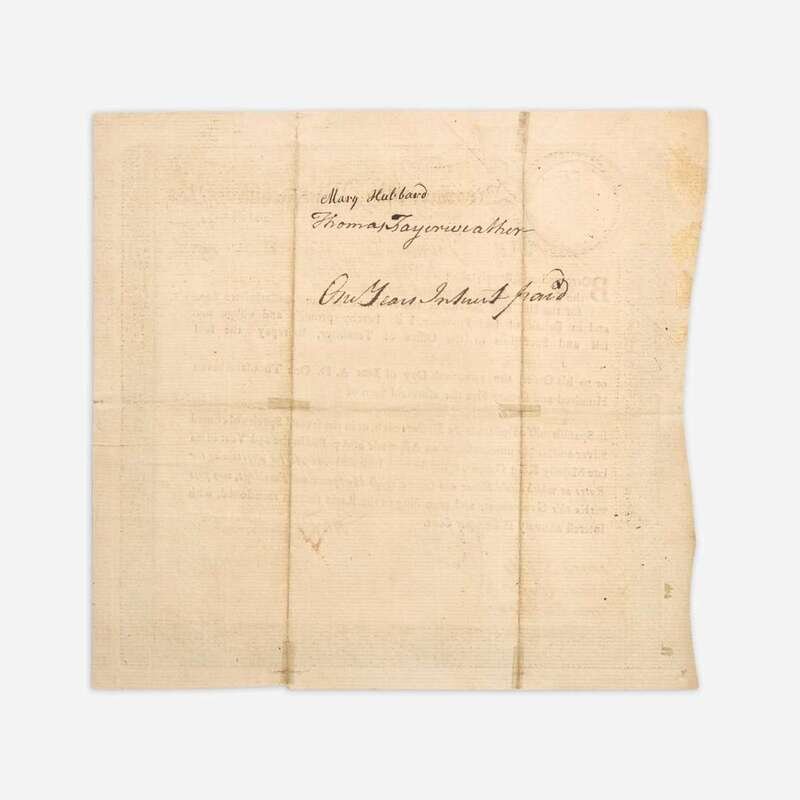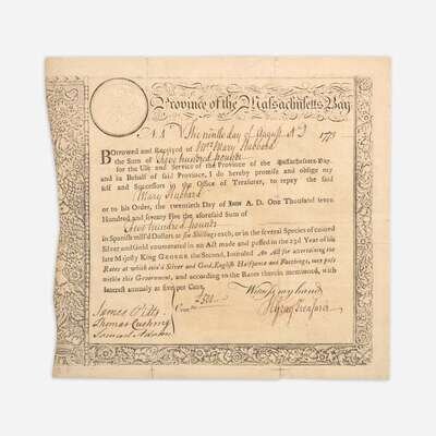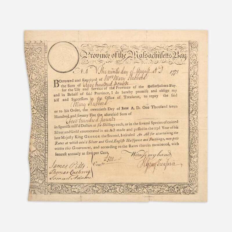 Massachusetts, August 9, 1773. One sheet, 7 3/4 x 8 in. (197 x 203 mm). Partially-printed Province of the Massachusetts Bay bond (N: 4), signed by Founding Father and Signer of the Declaration of Independence, Samuel Adams, as a member of the Massachusetts General Court. Issued by the Province to Mrs. Mary Hubbard for "the Sum of Five hundred pounds for the Use and Service of the Province of the Massachusetts-Bay...promise...to repay the said Mary Hubbard or to his Order, the twentieth Day of June A.D. One Thousand seven Hundred and seventy Five...in Spanish mill'd Dollars at six Shillings each, or in the several Species of coined Silver and Gold...with Interest annualy at five per Cent." Signed by Treasurer H(arrison) Gray (1711-94), with cancellation marks, now very faded; counter-signed by Adams (1722-1803), James Pitts (1712-76), and Thomas Cushing (1725-88) of the committee; signed on verso by Hubbard and Boston merchant Thomas Fayerweather (1724-1804), MS. on same, "One Years Interest paid"; embossed seal of the Province, top left corner recto. Creasing from contemporary folds, small separations at edges of same. Not in Anderson.