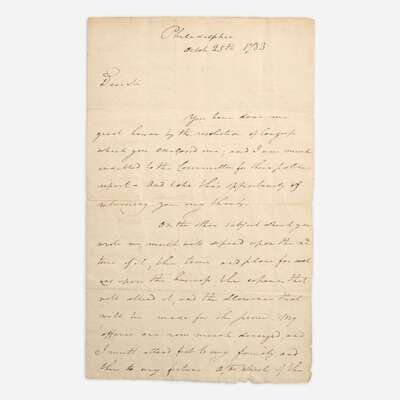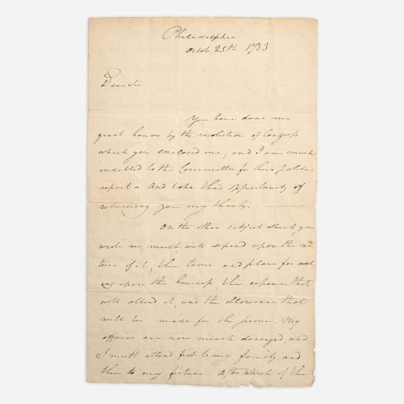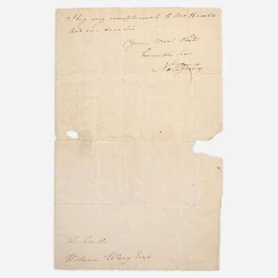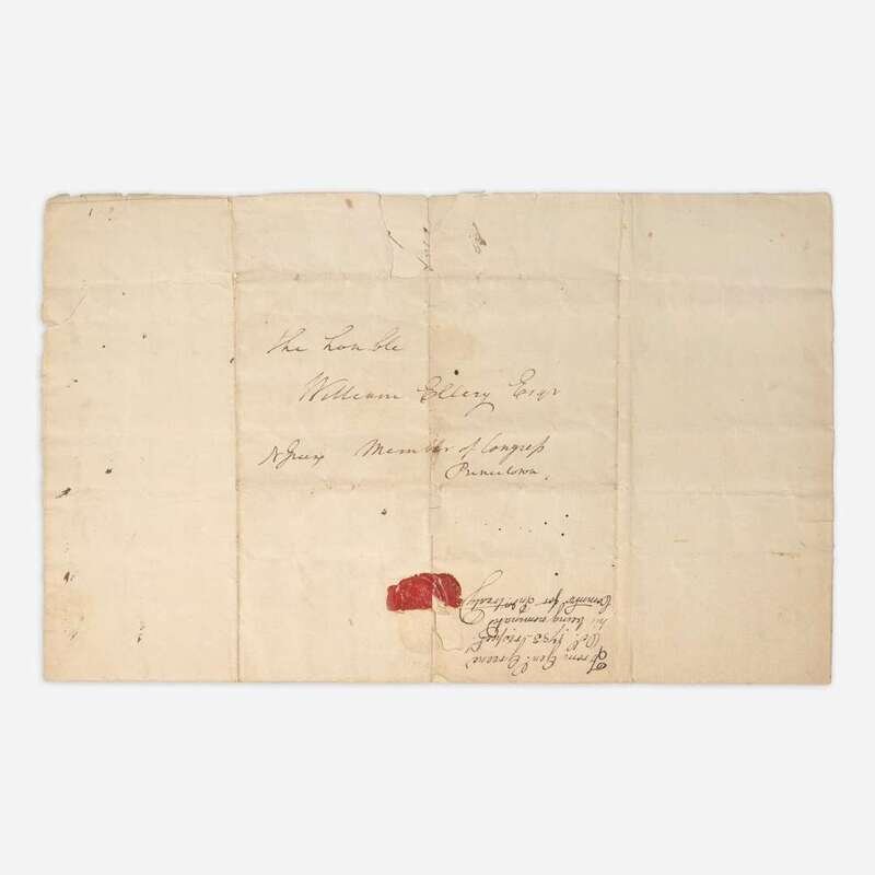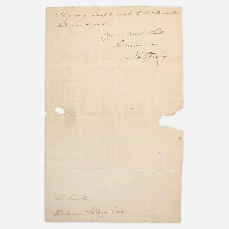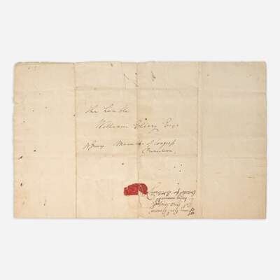 Philadelphia, October 25, 1783. One sheet folded to make four pages, including integral address leaf, 13 1/2 x 8 1/4 in. (343 x 209 mm). Autograph letter, signed by Greene to Rhode Island Signer of the Declaration of Independence, William Ellery (1727-1820), declining an appointment as an Indian Commissioner in the Northwest Territory; integral autograph address leaf, free franked and signed by Greene; docketed to same; original red wax seal partially intact, loss opposite same from when opened; creasing from original folds, scattered separations along same. Lot includes an engraved image of Greene.