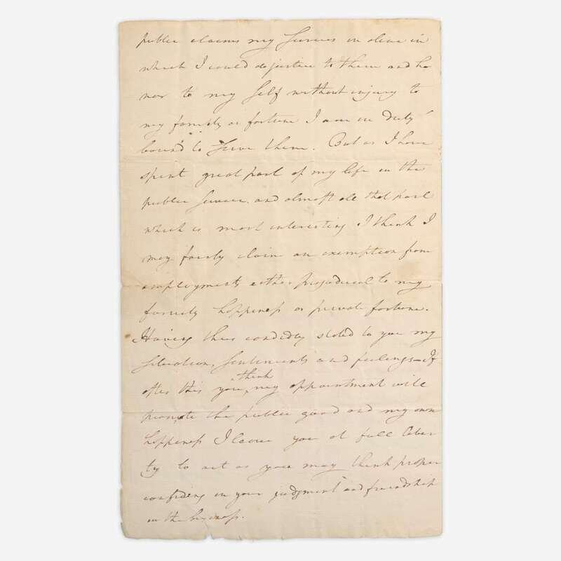 On the other subject which you wrote me, much will depend upon the nature of it, the time and place for meeting upon the business, the expense that will attend it, and the allowance that will be made for the service. My affairs are now much deranged, and I mustt (sic) attend first to my family, and then to my future. After which if the public claims my Service in aline in which I could do justice to them and honor to my Self without injury to my family or fortune I am in duty bound to serve them. But as I have spent great part of my life in the public Service and almost all that part which is most interesting I think I may fairly claim an exemption from employment either prejudicial to my family happiness or private fortune. Having thus cordially stated to you my situation, sentiments and feelings--if after this you think my appointment will promote the public good and my own happiness I leave you at full liberty to act as you may think proper confiding in your judgment and friendship in the business.