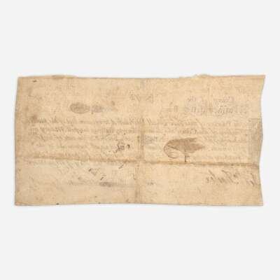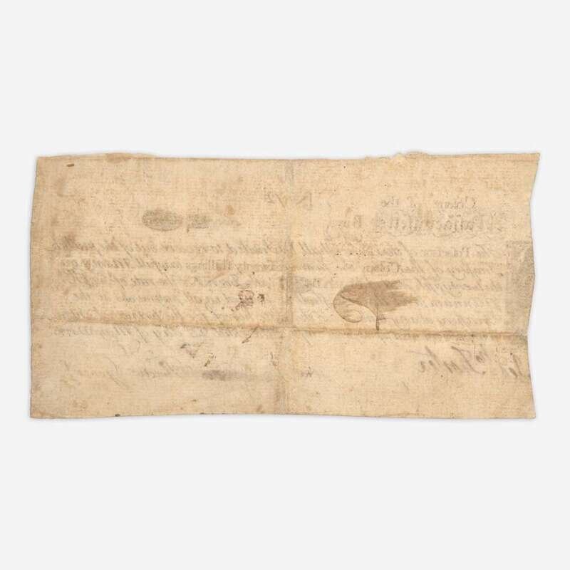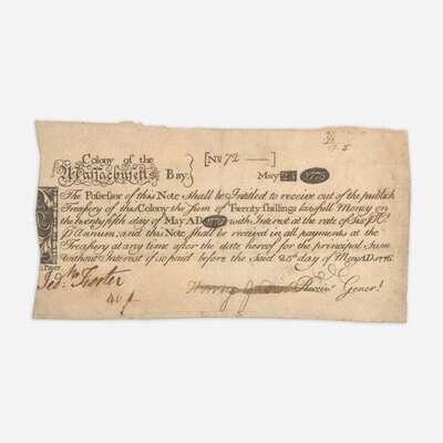 Colony of the Massachusetts Bay, May 25, 1775. One oblong sheet, 3 1/4 x 6 1/2 in. (82 x 165 mm). Partially-printed Colony of the Massachusetts Bay 20 shilling note (No. 72), engraved by American Patriot and silversmith Paul Revere: "The Possesor of this Note shall be Intitled to receive out of the publick Treasury of this Colony the sum of Twenty shillings lawfull Money on the twenty fifth day of May AD 1776 with Interest at the rate of Six PrCt. pr Annum..."; indented along left edge from when cut, "(America)n Paper" printed at same; signed by Henry Gardner as Receiver General, bottom right, and now crossed out; counter-signed by Jed(edia)h: Foster, bottom left. Brigham pp. 142-44; Newman, p. 202; See Anderson MA-1 for his note concerning this currency issue.