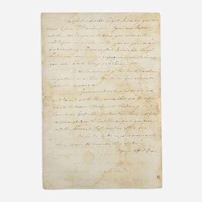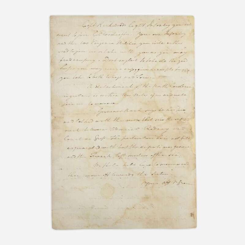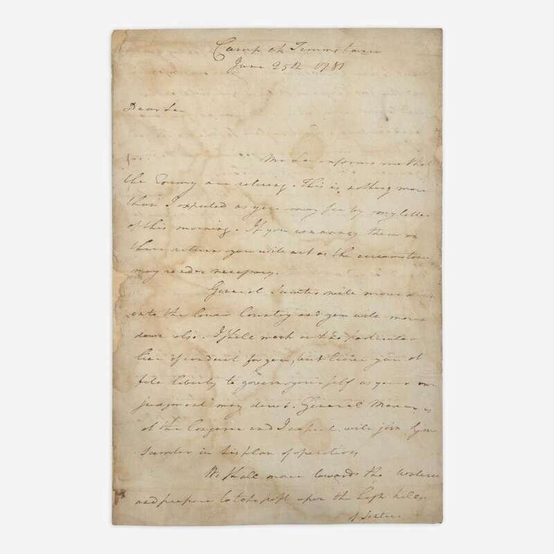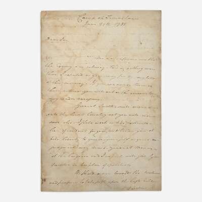 (South Carolina): Camp at Timms tavern, June 25, 1781. One sheet folded to make four pages, 14 5/8 x 9 3/4 in. (371 x 248 mm). Autograph letter, signed by Nathanael Greene to Col. Henry "Light-Horse Harry" Lee, concerning his campaign to retake Georgia from the British; addressed on integral leaf by Greene, "Lt Colonel Lee"; repaired along center fold; creasing from original folds; dampstaining and soiling to each page. Lot includes an engraved image of Greene.