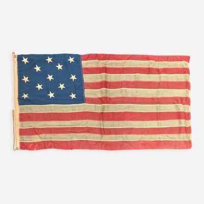 With large cotton hand-sewn stars arranged in a 3-2-3-2-3 pattern on a wool bunting canton, machine-sewn wool bunting stripes, canvas header retains hemp rope and is fitted with two brass grommets. Mounted on fabric.